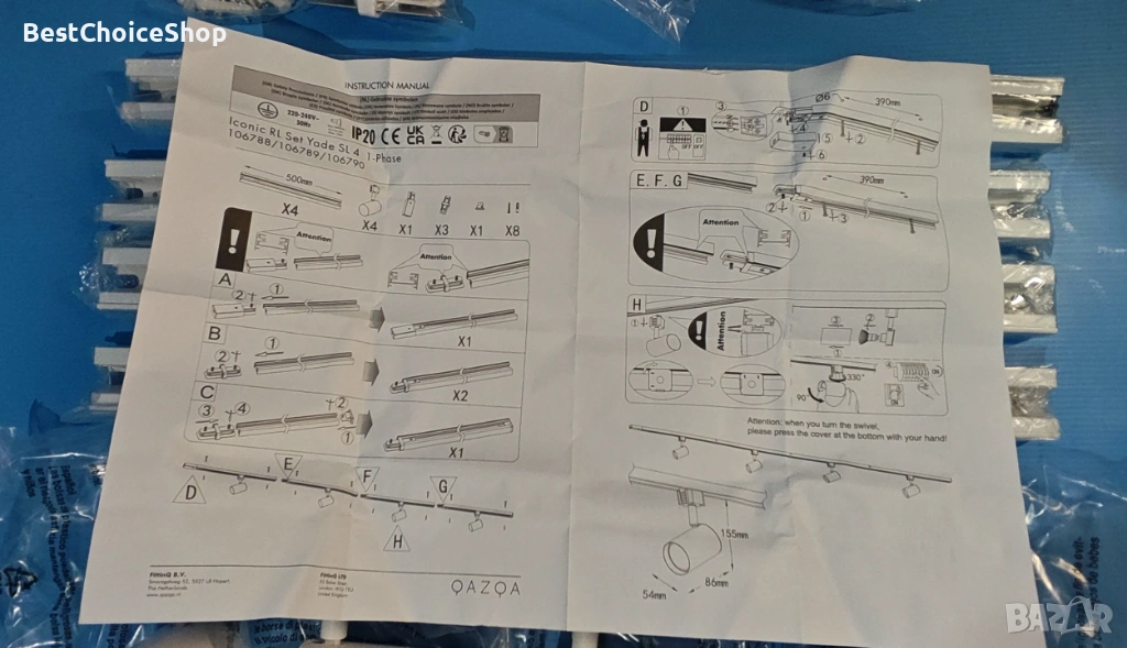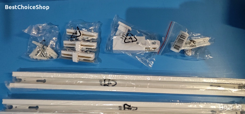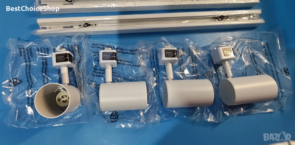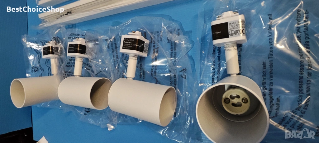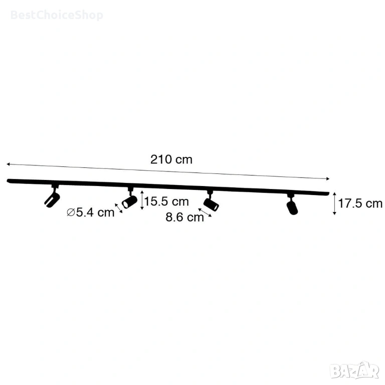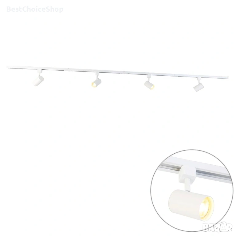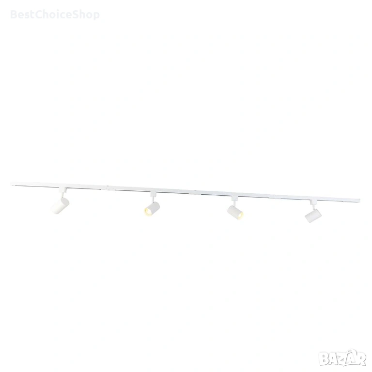 - Системата включва релса с дължина 210 см и 4 регулируеми спота (прожектора).