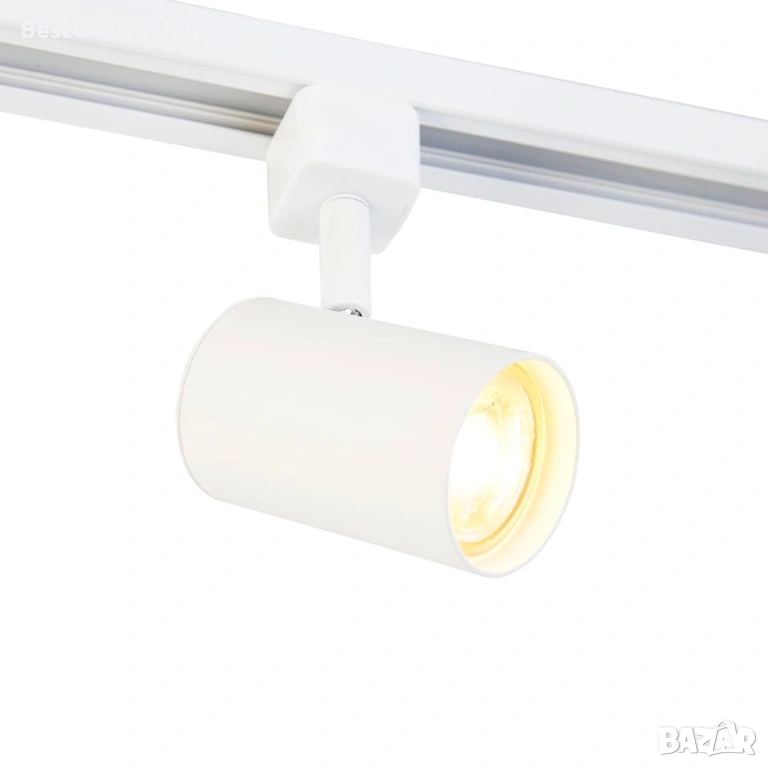 Модерна еднофазна релсова осветителна система в бял цвят, подходяща за трапезарии, офиси, кухни или изложбени зали.