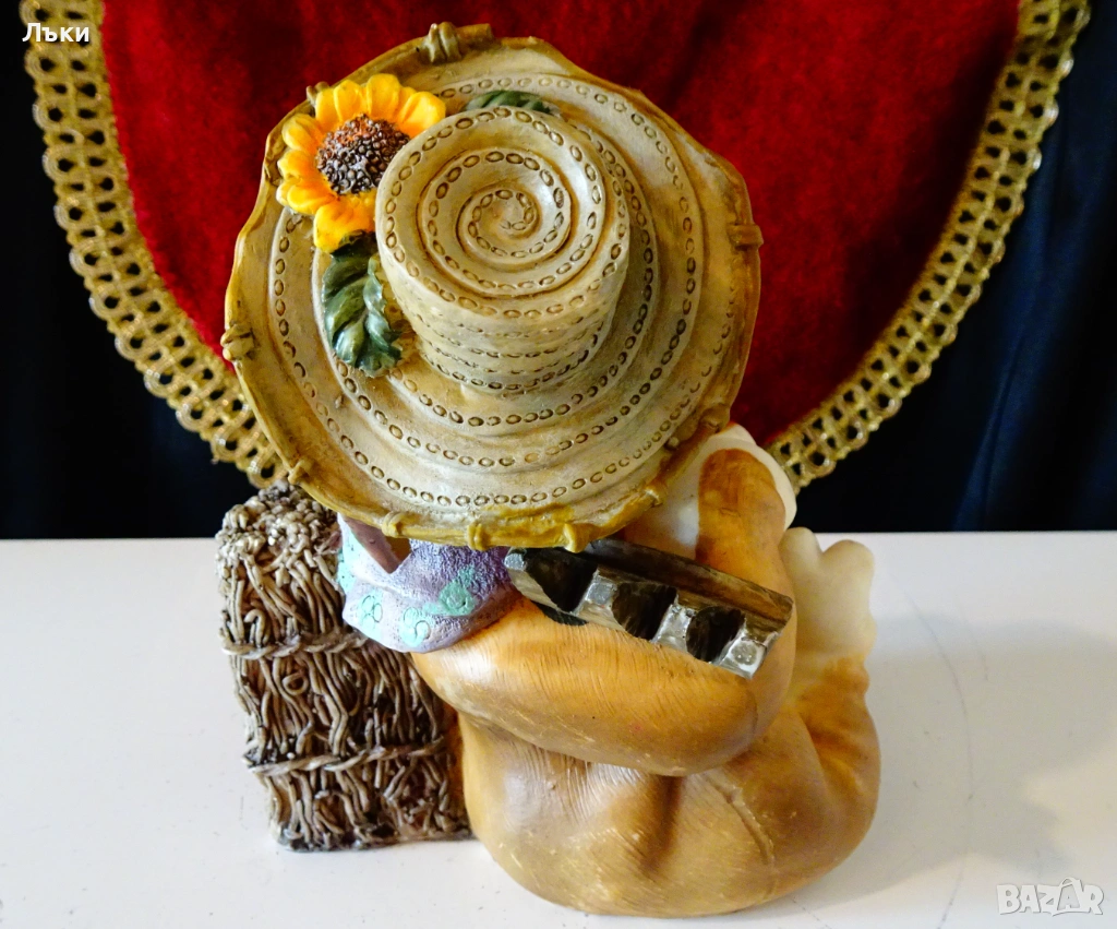 оръфана сламена широкопола шапка,закичена със слънчоглед,носи през рамо