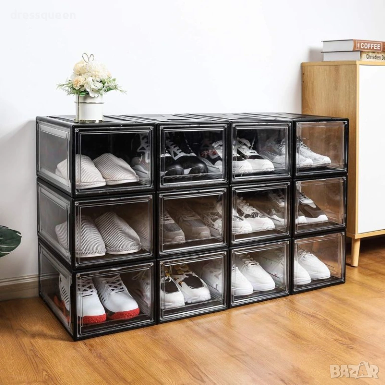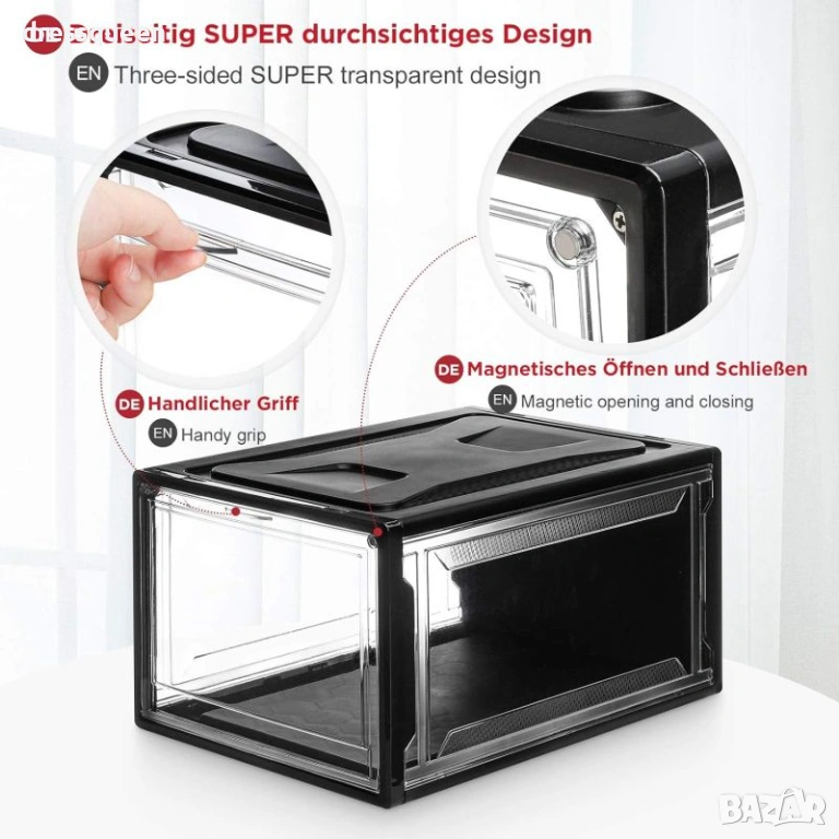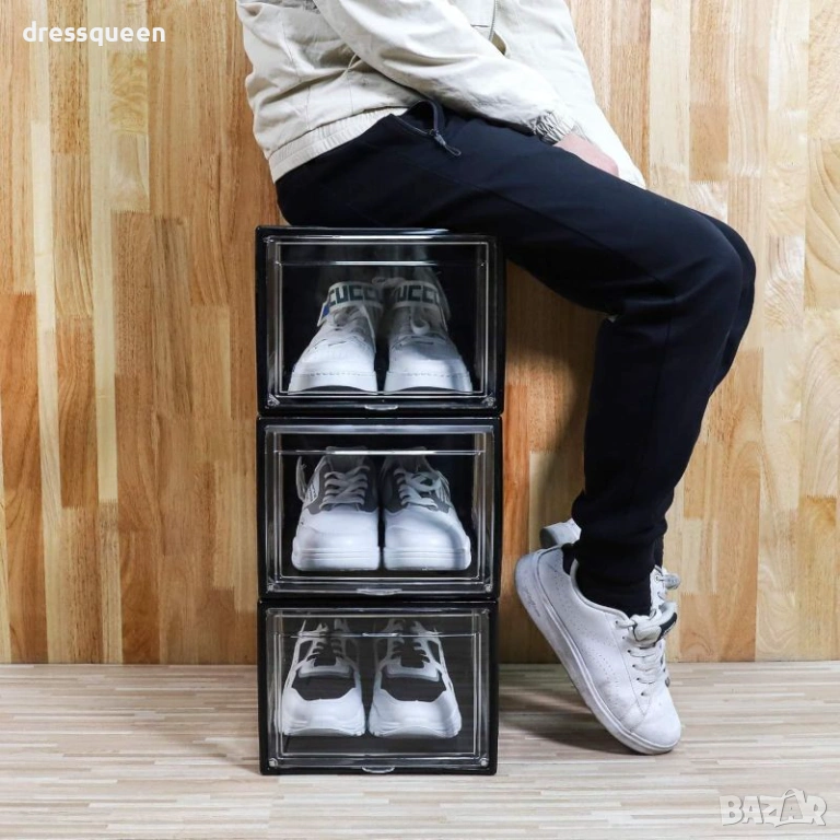 Прозрачна кутия за обувки с магнитна вратичка черна твърда пластмаса
