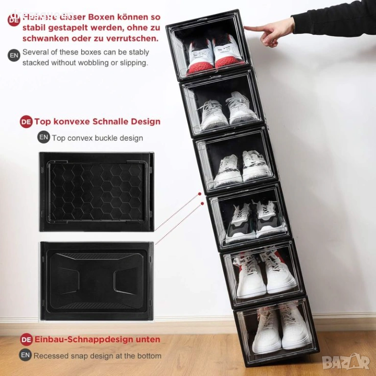 Край на разхвърляните обувки и деформираните кутии в гардероба! Нашата черна кутия от твърда пластмаса е идеалното решение за организиране на големи номера обувки (до 46-ти размер). Магнитният механизъм на вратичката предотвратява самоволното отваряне, а твърдата конструкция гарантира, че кутията няма да се огъне дори ако поставите много други върху нея. Прозрачната лицева част ви позволява да виждате съдържанието веднага, спестявайки време всяка сутрин. Продуктът е водоустойчив, лесен за почистване и добавя модерен, индустриален облик на всяко помещение.
