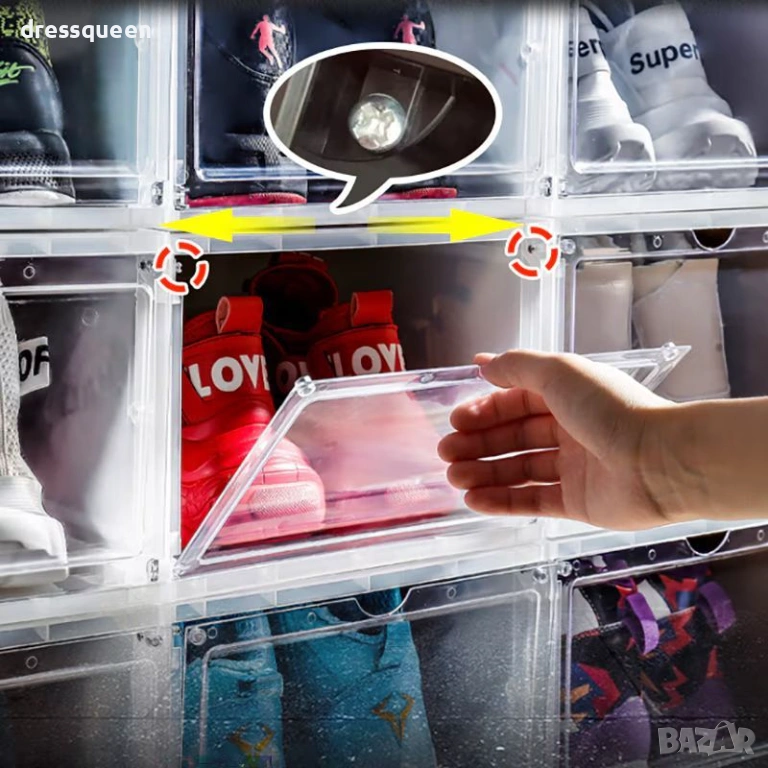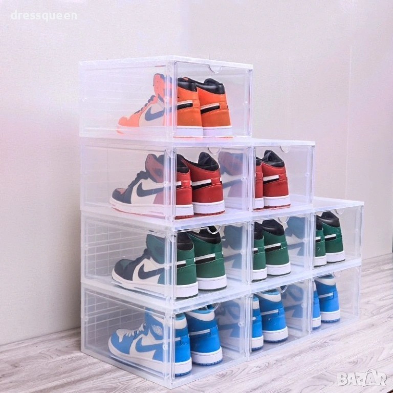 Защитете инвестицията си в качествени обувки с нашия най-издръжлив модел органайзер. Изработена от плътна и здрава пластмаса, тази кутия не се огъва и запазва формата си дори при подреждане в солени колони. Магнитният механизъм на капака гарантира, че вратичката ще остане плътно затворена, спирайки достъпа на прах и влага. Благодарение на широкия си дизайн, тя побира без проблем високи маратонки, официални обувки или боти до размер 46. Изключително лесна за поддръжка и почистване, тя е идеалното решение за дългосрочна организация на вашия дрешник или антре.