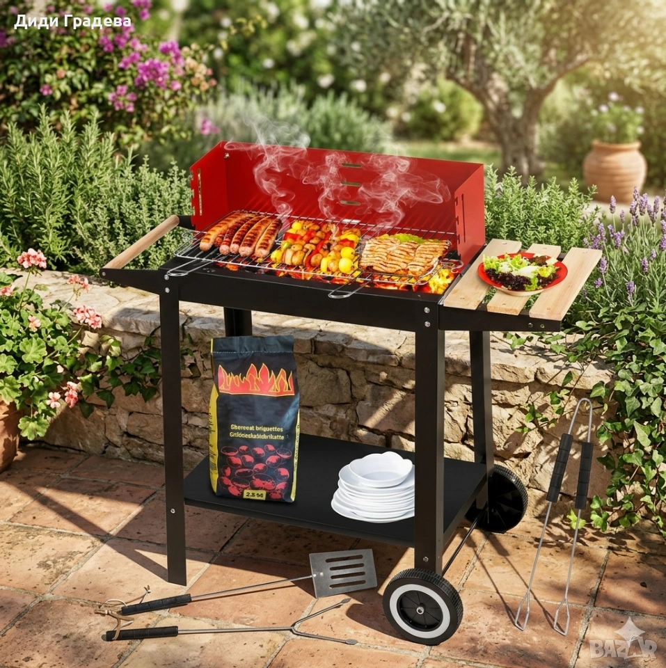 Градинско барбекю на колела, емайлирана стомана, 4 степени + Подарък 3 прибора