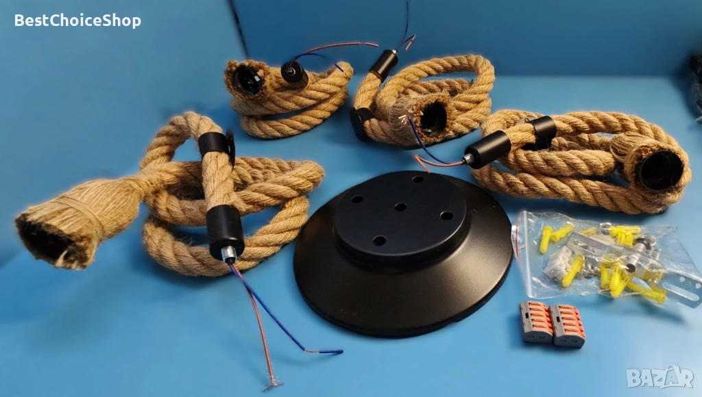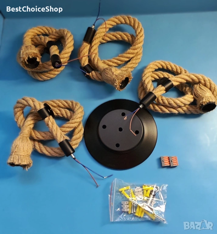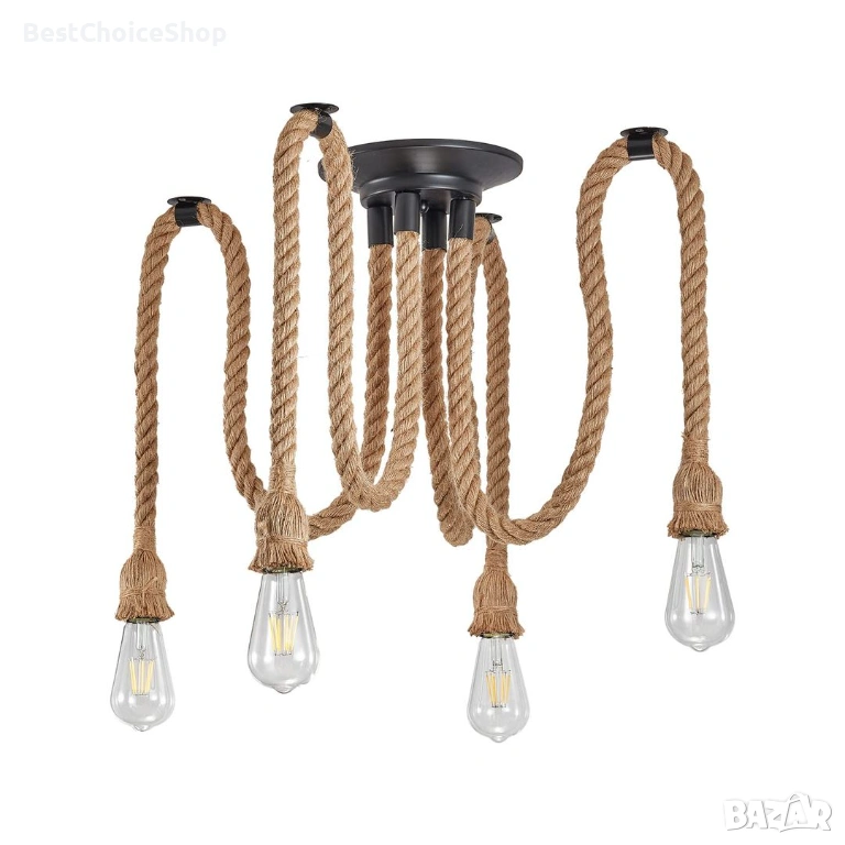 винтидж пендел от конопено въже, висящ полилей с 4 гнезда