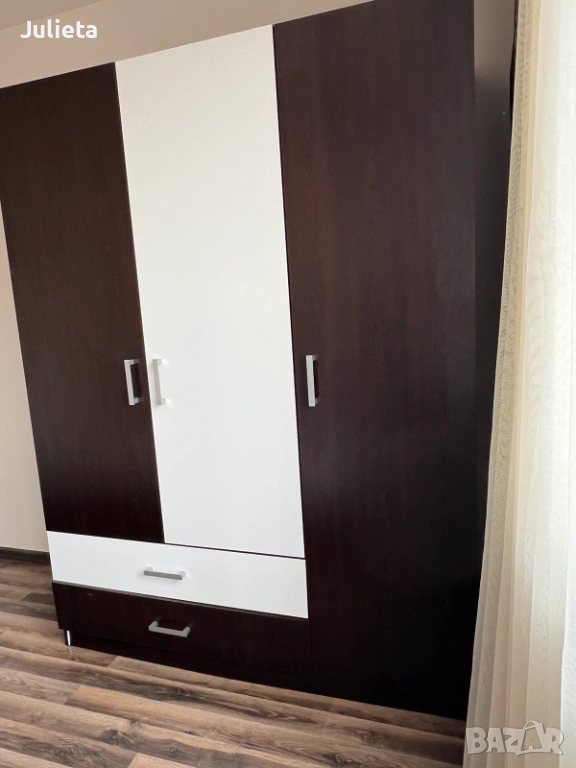 • Тип: Трикрилен гардероб с лост за закачалки, рафтове и две чекмеджета.