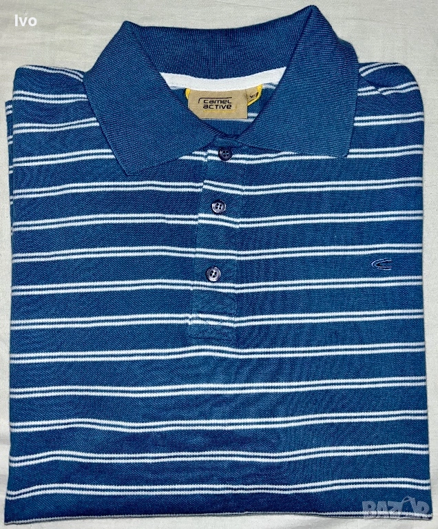 Тази мъжка поло тениска е на марката Camel Active, както се вижда от етикета на яката и дискретното лого на гърдите. Моделът е в класически син цвят с бели хоризонтални райета и стандартна яка с три копчета.