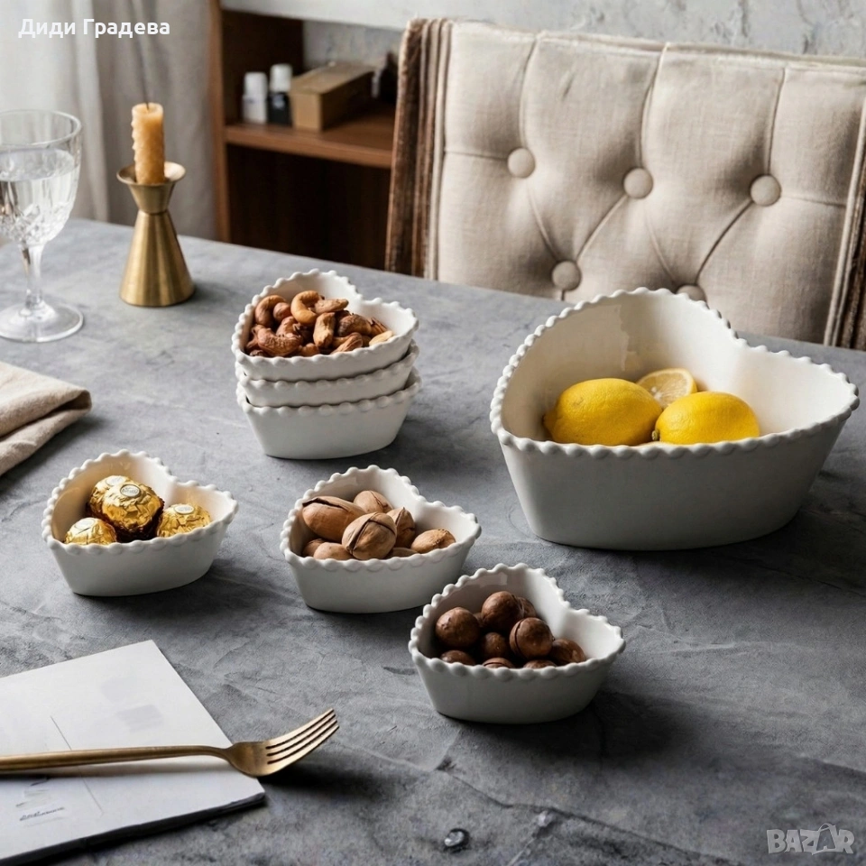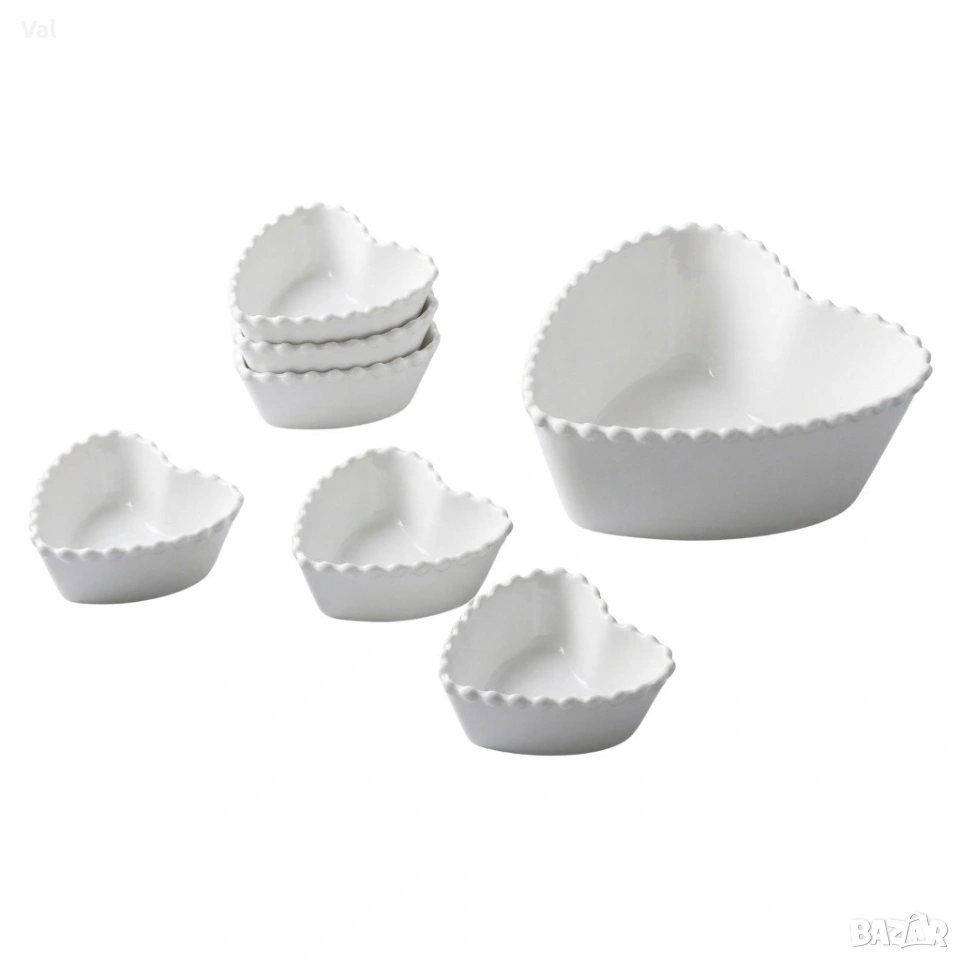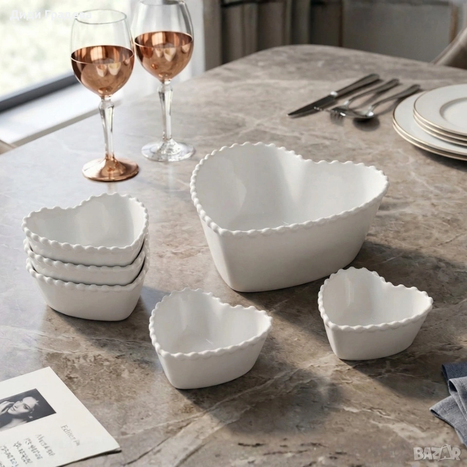 Материал: висококачествен порцелан Брой части: 7 (6 малки купи + 1 голяма купа) Финиш: бяла глазура с матов/леко лъскав ефект Подходящо за ежедневно ползване и специални поводи Препоръки за поддръжка: ръчно миене или щадяща програма за съдомиялна машина