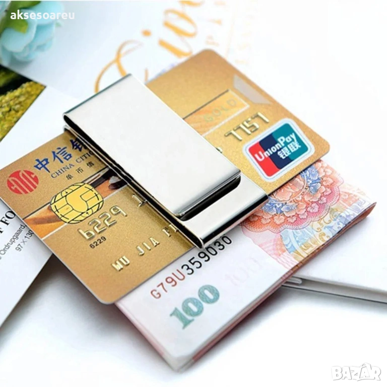 Пакетът включва: 1 бр. щипка за пари, кредитни и дебитни карти, лични карти и
