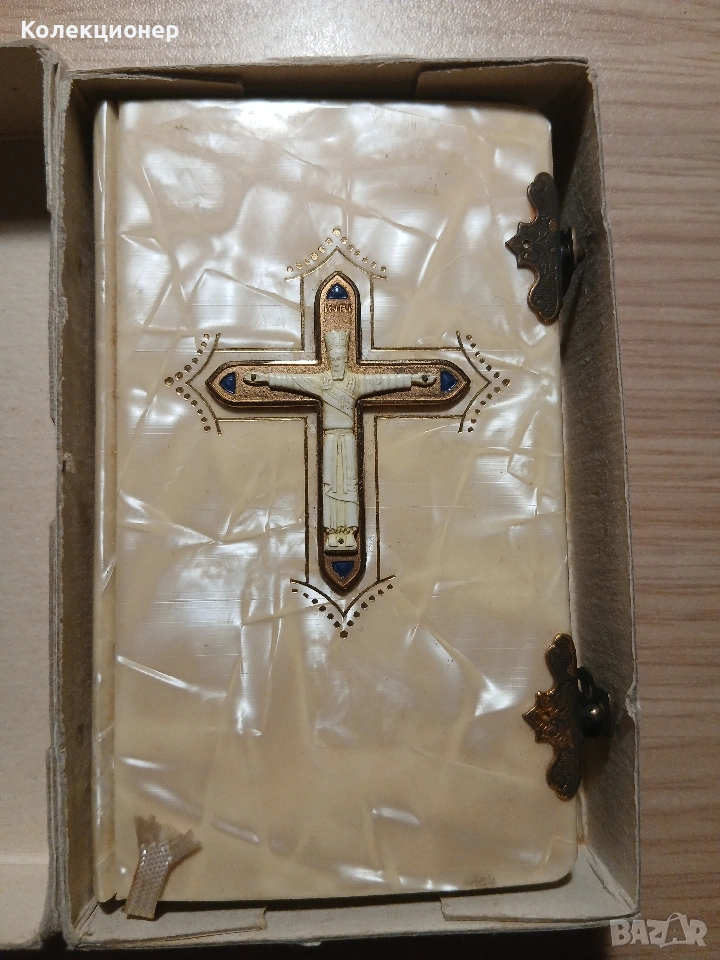 ​Корици: Изработени от материал, имитиращ седеф (celluloid/mother of pearl effect), с вградено разпятие и орнаменти.