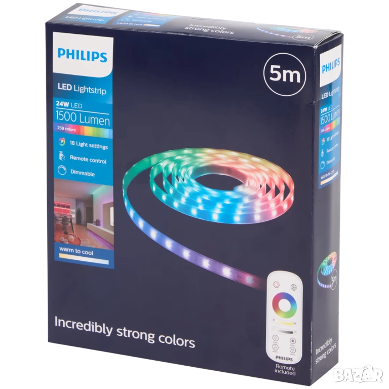 Продавам чисто нова Philips LED Lightstrip 5 метра – мощна и гъвкава LED лента с много цветове, режими и дистанционно управление. Подходяща за декорация и осветление на дом, стая, TV зона, гейминг setup или мебелно осветление.