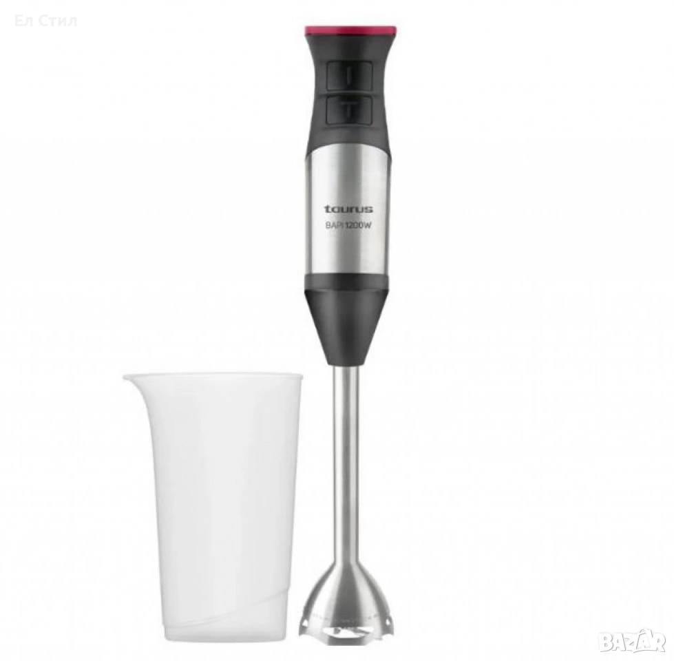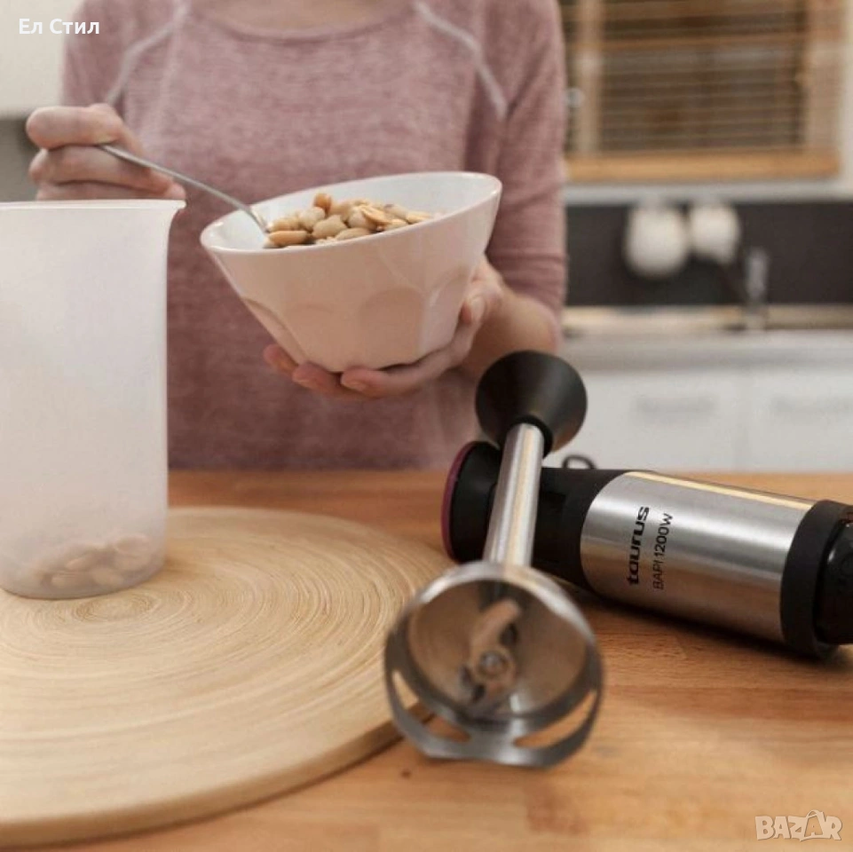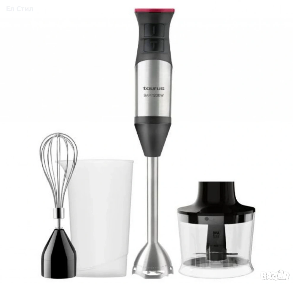 Модел: Taurus BAPI® 1200 PLUS INOX – с пълен комплект аксесоари:Мощност: 1200W;Управление: 20 скорости + Turbo функция;Система: Turbo Rotation – подобрена циркулация на храната;Остриета: Неръждаема стомана, с двоен ефект (пасиране + нарязване);Пръчка: Неръждаема стомана, подвижна;Ергономична дръжка Soft Touch + предпазител от пръски;Поддръжка: Аксесоари и пръчка, подходящи за съдомиялна машина;Материали: Без BPA;Включени аксесоари: Мерителна чаша, чопър, емулгатор.Модел: Taurus BAPI® 1200 INOX – с 1 аксесоар-45 евро