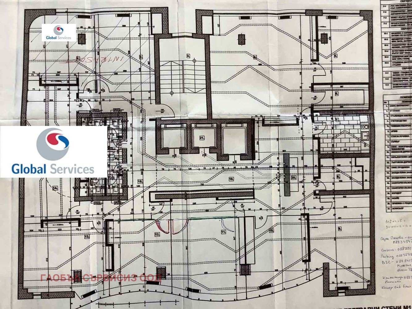 Open Space със разпределение на 9 работни помещения за 35-40 човека със стъклени преградни стени и вградени поръчкови офис мебели. Предверие, Рецепция, две обединяващи се заседателни зали, оборудвана кухня, 4 тоалетни, архив, сървърно и сервизно помещение.