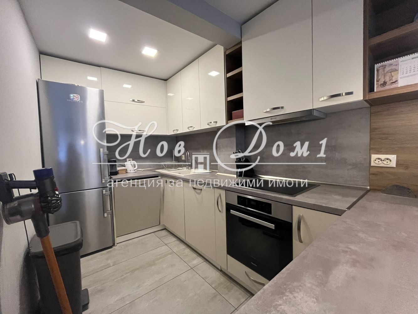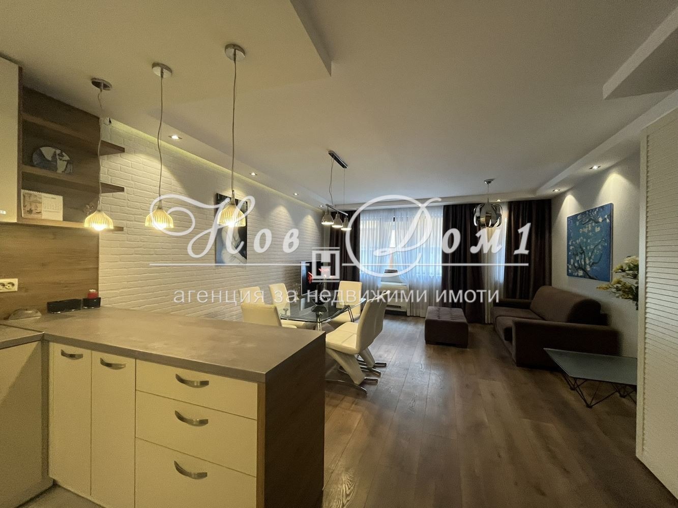 Просторна дневна с дизайнерски мебели и кухненски бокс, оборудван с последно поколение електроуреди