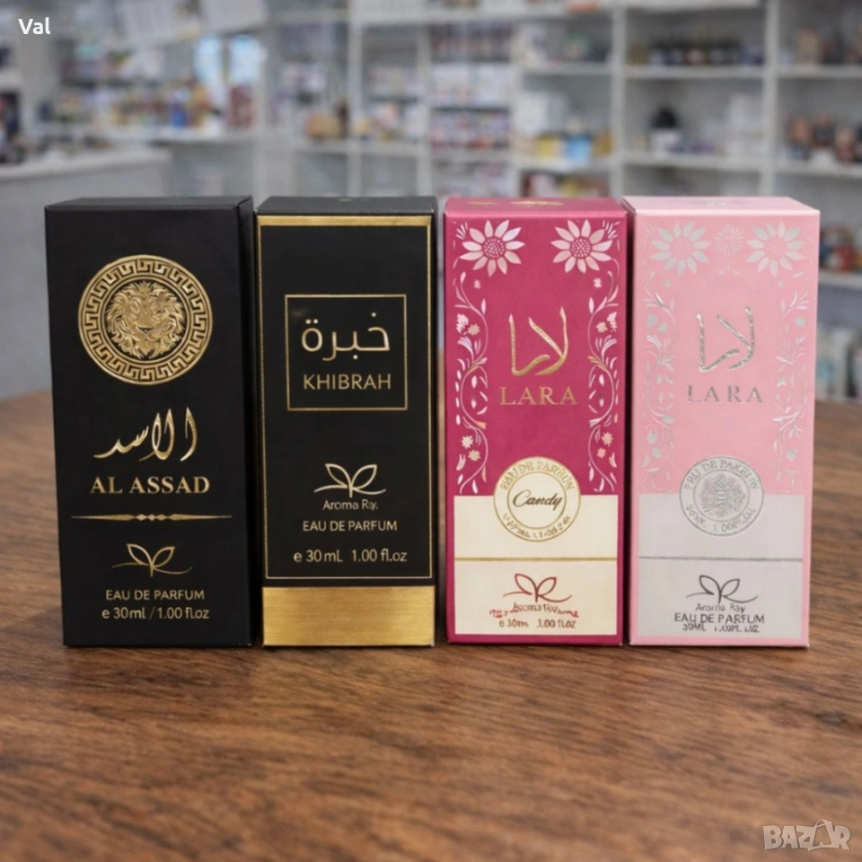 Комплектът включва: Lara Pink - for women 30ml Eau De Parfum, Lara Candy - for women 30ml Eau De Parfum, KHIBRAH - unisex 30ml Eau De Parfum, AL ASSAD - for men 30ml Eau De Parfum.