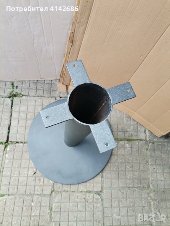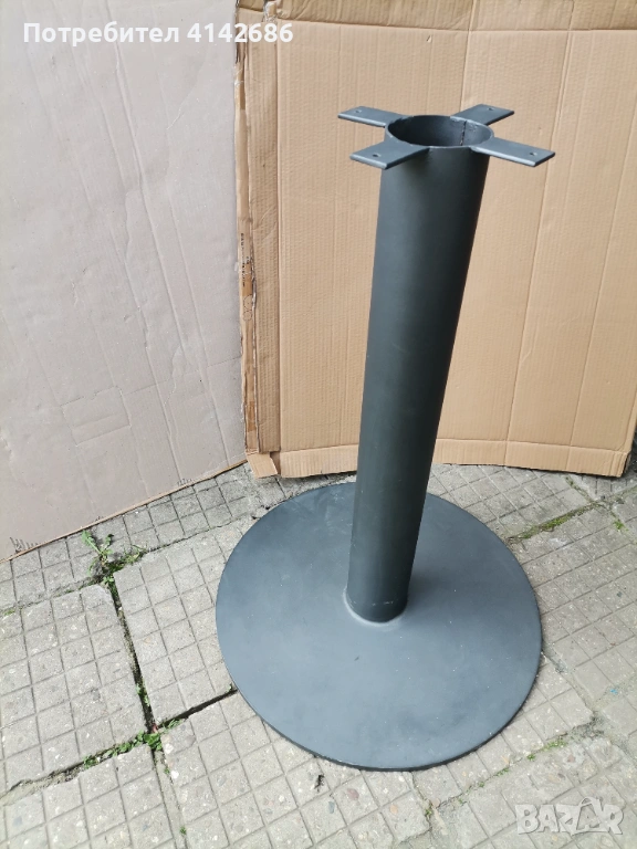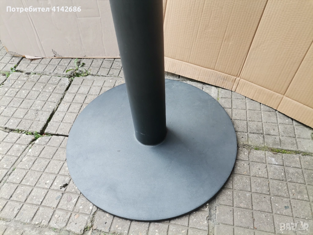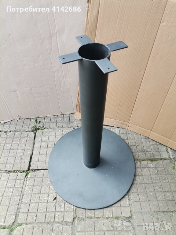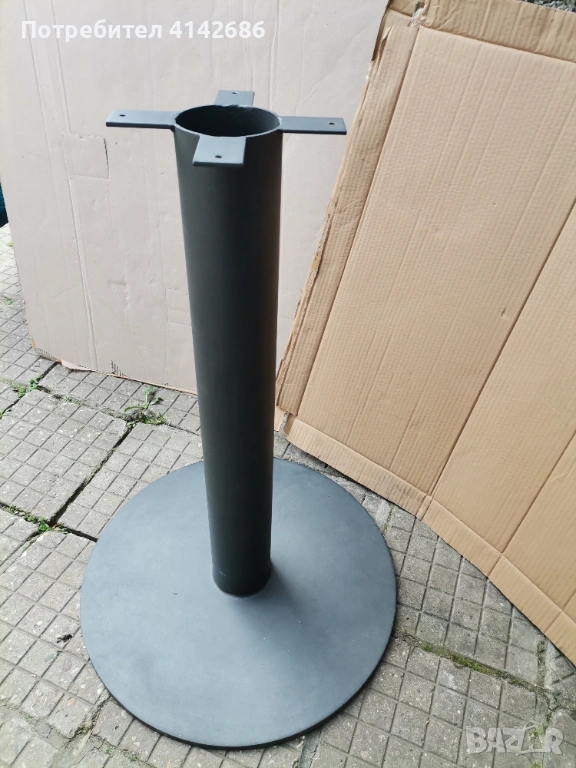 Здравейте, продавам метална основа за маса цвят антрацит. Основата е масивна и доста тежка, размерите са следните: диаметър на основата 55см., височина на тръбата 76 см., и диаметър на тръбата 10 см. Цена 75 евро.