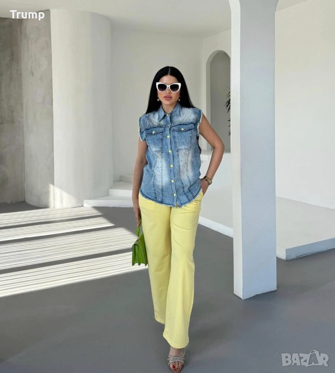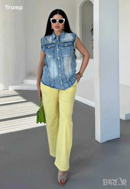 Ефектен комплект от елек деним и панталон жълт цвят → Обява 53931102