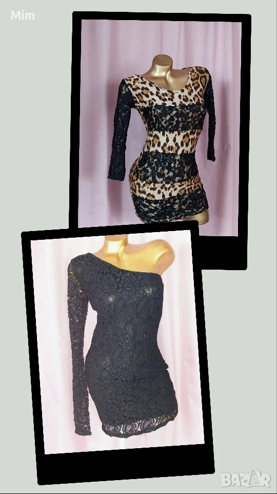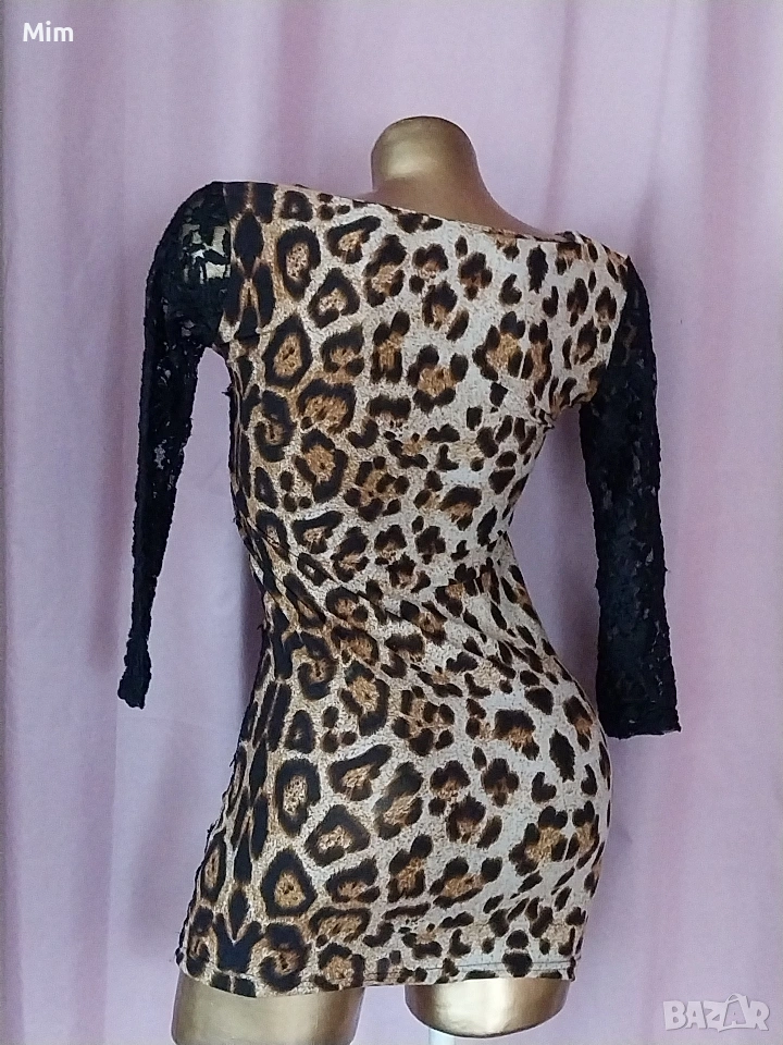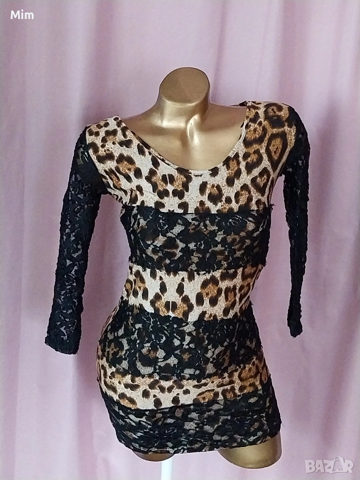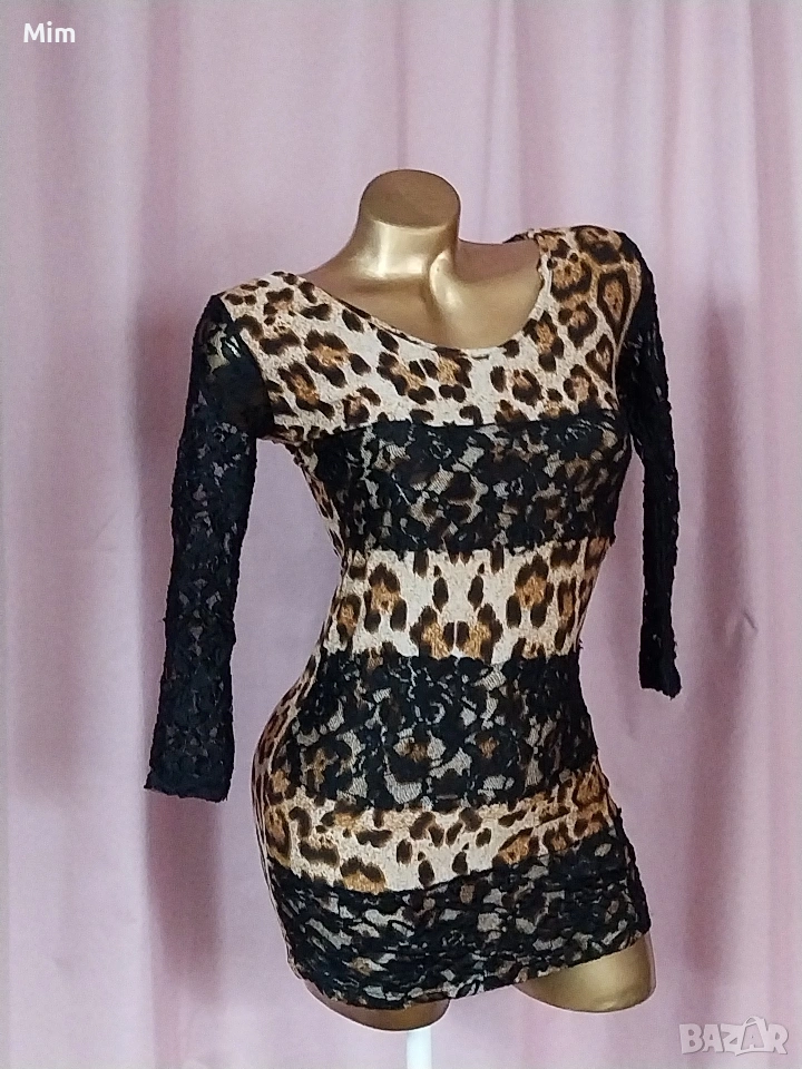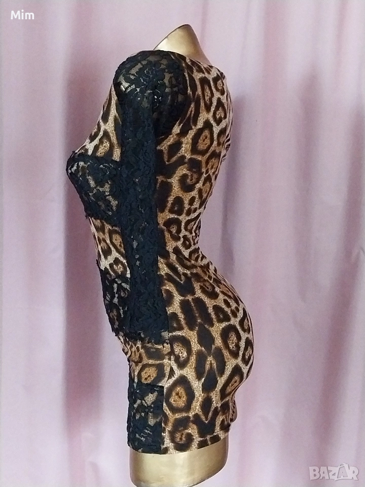 2 - Къса еластична рокля с дълъг ръкав, анимал принт с черна дантела на ръкавите и отпред, гръдна 80 до 90 см еластичност, дължина 75 см без забележки, цена - 8 €