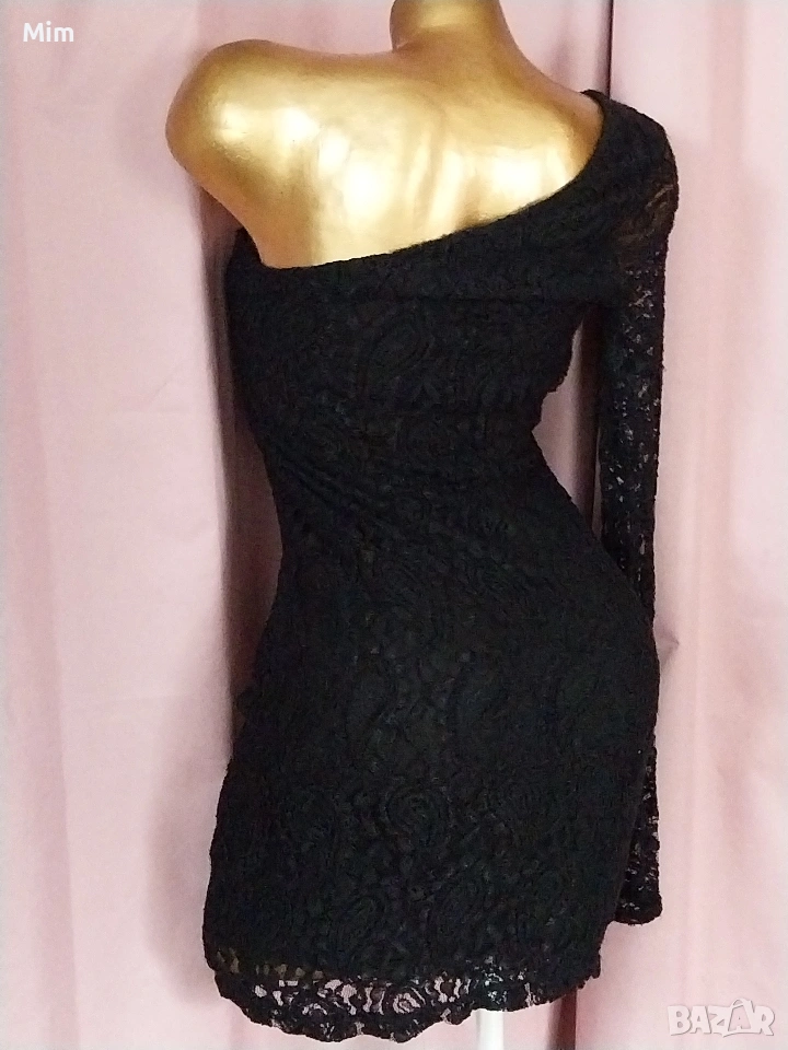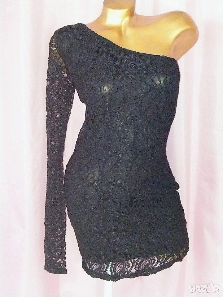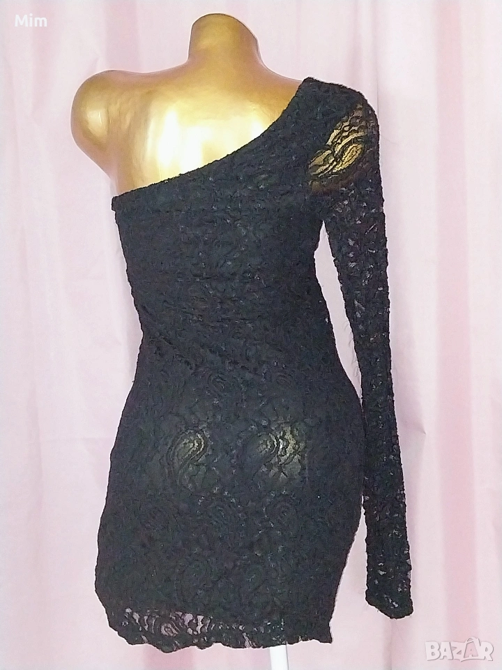 1-М /Черна еластична дантела рокля с един дълъг ръкав, гръдна от 80 до 90 см еластичност, дължина 85 см с подплата, без забележки цена- 8€