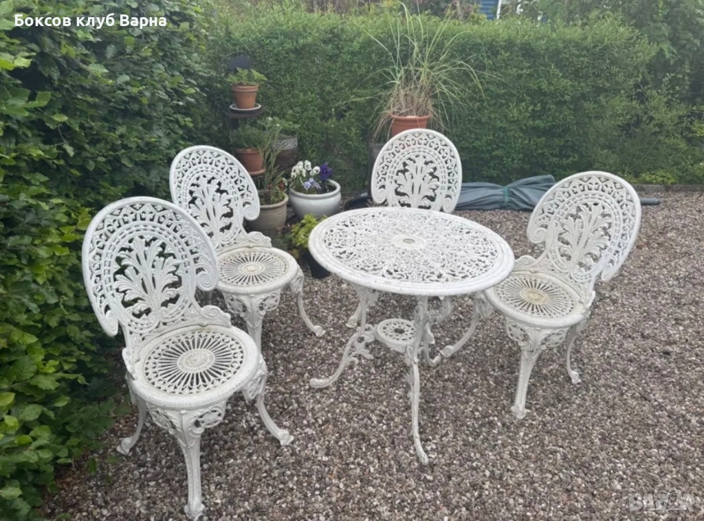 Продавам столове и маса за градина във винтидж стил . Комплекта е много стар и се нуждае от реновация или може да се остави в старинния вид, в който е