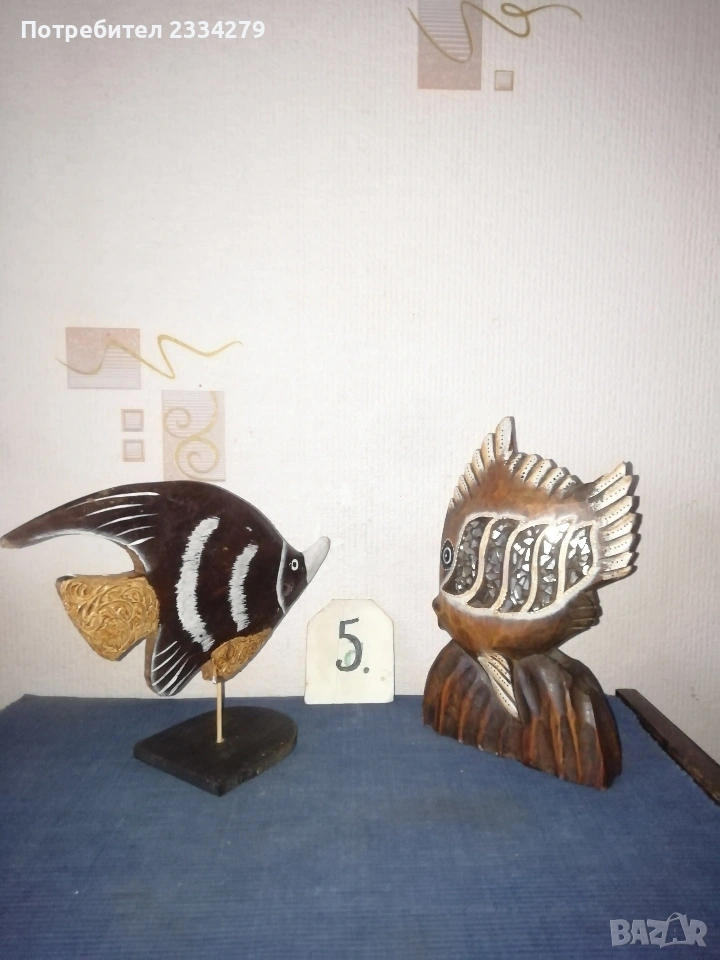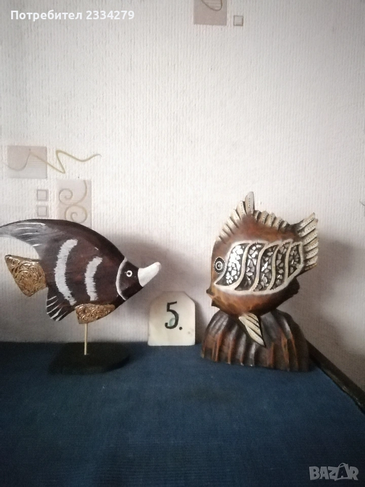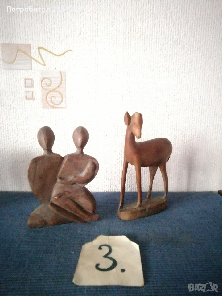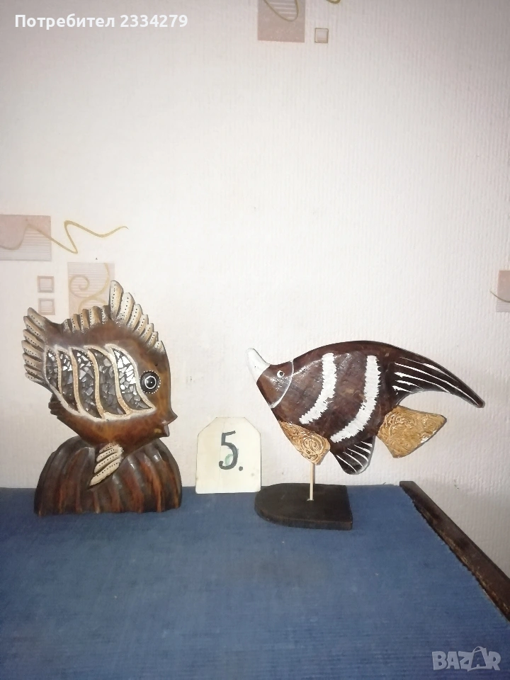 дърворезба, размер 16х11см., авторска изработка, цена 10€.; Стара дървена фигура на газела, финна авторска дърворезба с размери 17х10см., цена 5€.; N:4 две ръчно изработени дървени фигури на африкански туземци, размери 15х15см., 15х9см., цена 5€. брой, (двете 8€); N:5 ръчно изработени дървени склуптури на риби, декорация за дома от Индонезия, размери на тази с масивна та стойка дърворезба 23х15см., ръчно орнаментирана, рисувана и резбована, цена 12€.; статуетка фигура на риба ръчно резбована и рисувана, размери 20х19см., цена 7€.