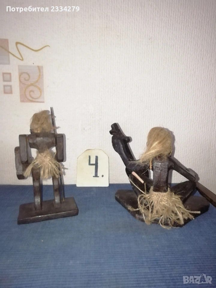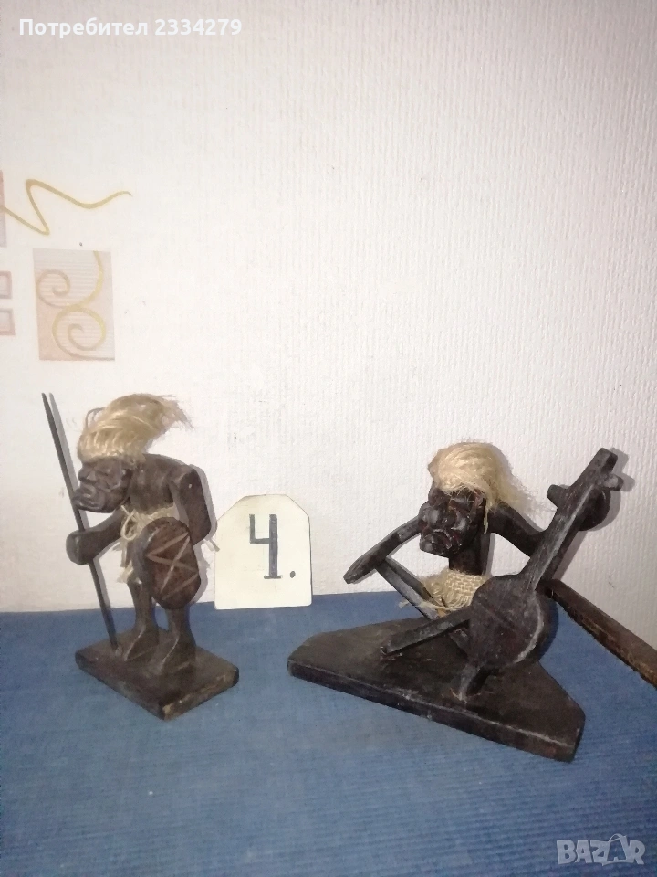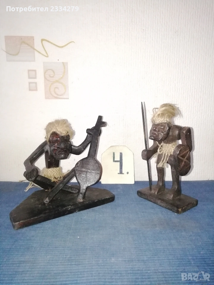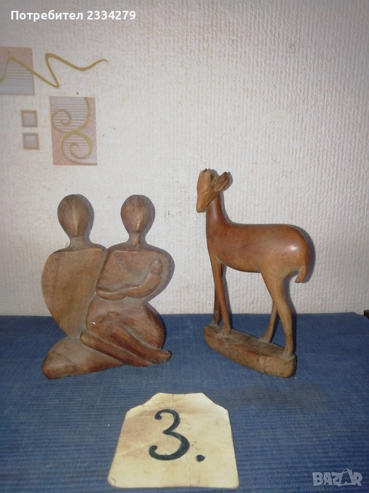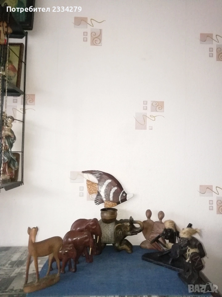 дърворезба, размер 16х11см., авторска изработка, цена 10€.; Стара дървена фигура на газела, финна авторска дърворезба с размери 17х10см., цена 5€.; N:4 две ръчно изработени дървени фигури на африкански туземци, размери 15х15см., 15х9см., цена 5€. брой, (двете 8€); N:5 ръчно изработени дървени склуптури на риби, декорация за дома от Индонезия, размери на тази с масивна та стойка дърворезба 23х15см., ръчно орнаментирана, рисувана и резбована, цена 12€.; статуетка фигура на риба ръчно резбована и рисувана, размери 20х19см., цена 7€.