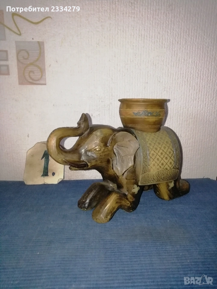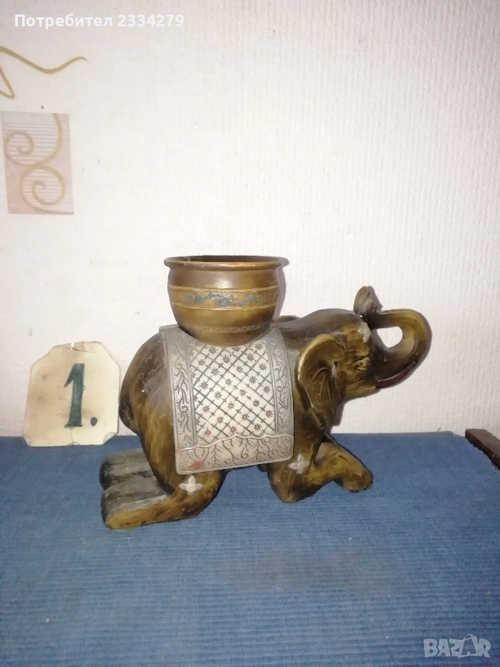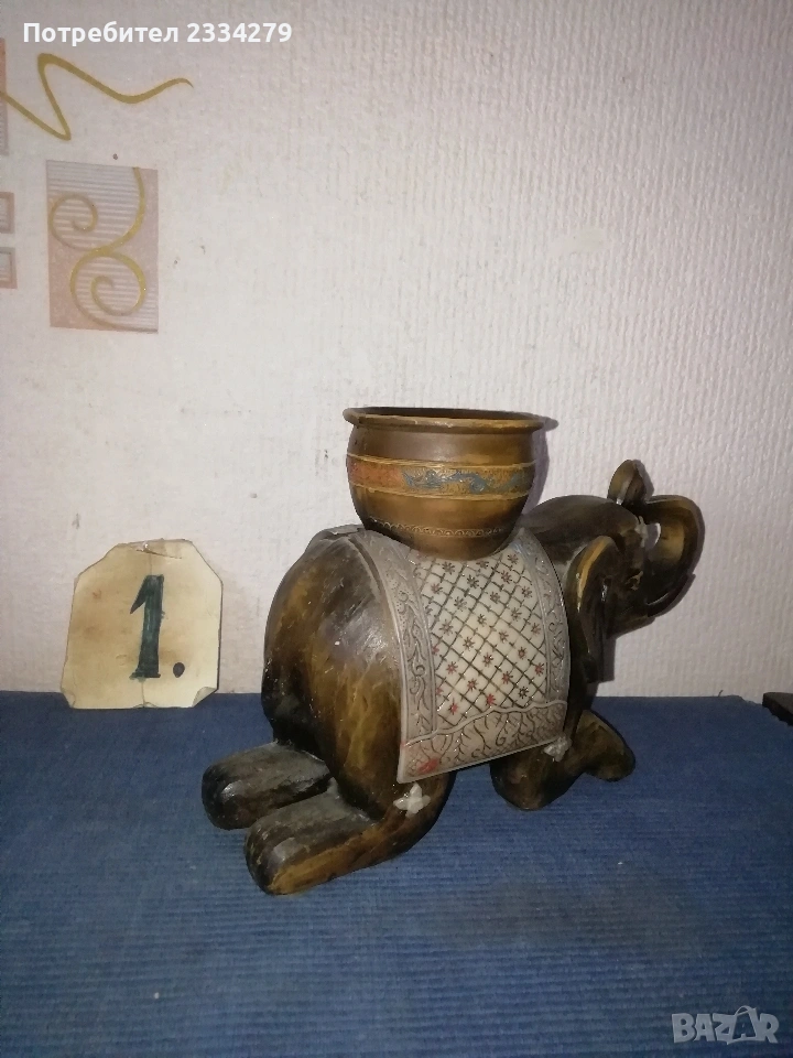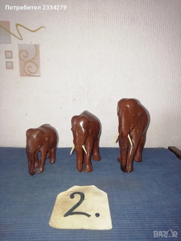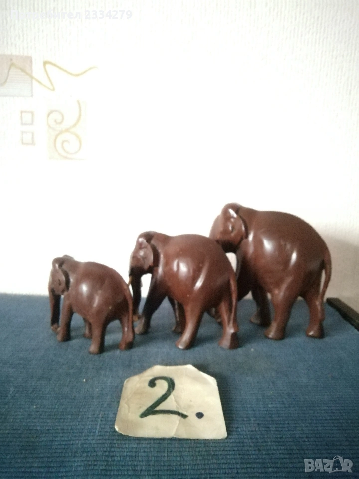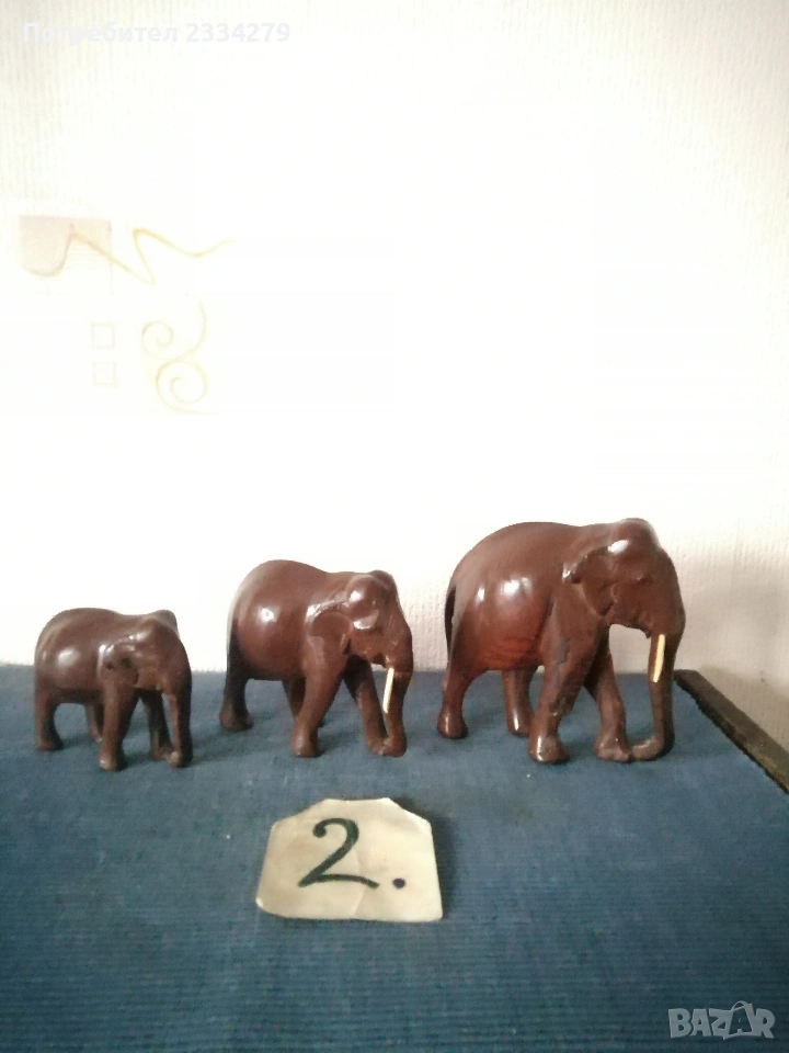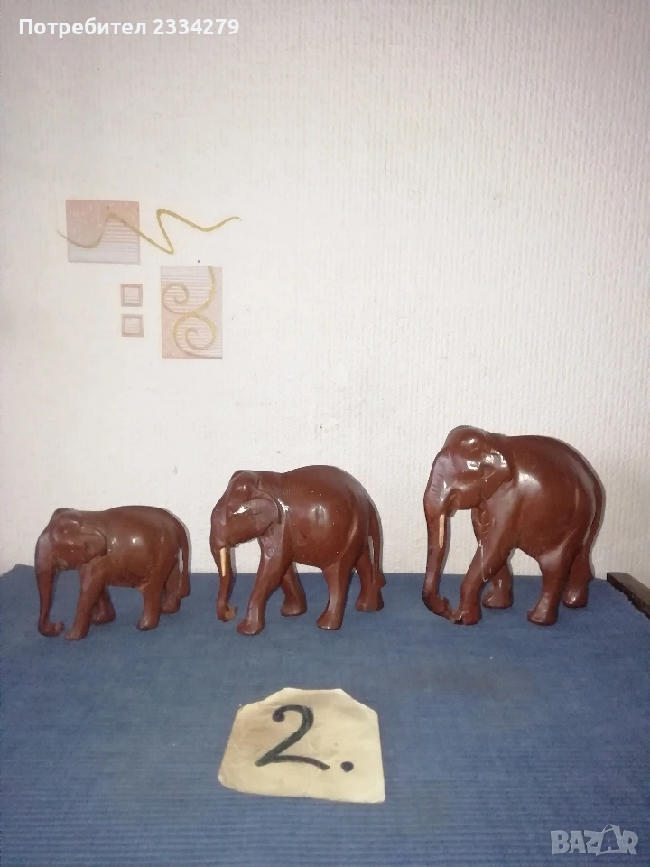 N:1 фигура на слон изработен от полизерин с кафяв и златист финиш, размер 20х15см., цена 7€.; N:2 три броя слонче та-семейство, ръчно изработени резбовани от тиково дърво майсур Индия или палисандър дърво от Тайланд, размери: 15х13см., 12х11см., 10х8см., цена за трите 20€.; N:3 австрактна резба на фигура, интерпретирана като семейство ,,дете, майка, баща" финна гладка