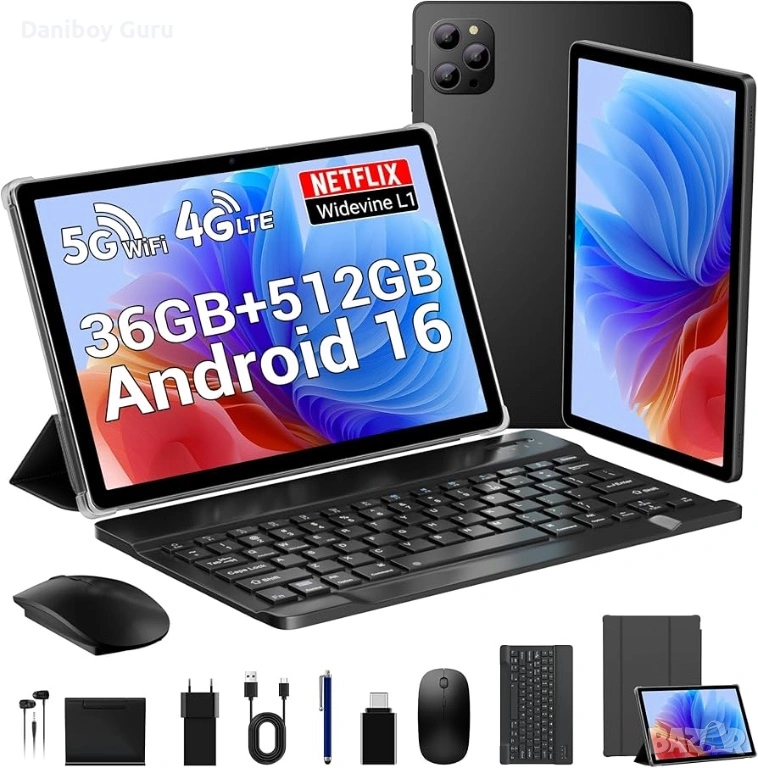 Livirtu 11-инчов Android 16 таблет с Octa Core, 12+24Gb. RAM + 512GB ROM (2TB TF), 4G LTE/5G WiFi, Gemini AI, 8000mAh, 13MP+8MP, GPS, Face ID, BT 5.0, таблет с клавиатура+мишка, стойка, калъф и др.