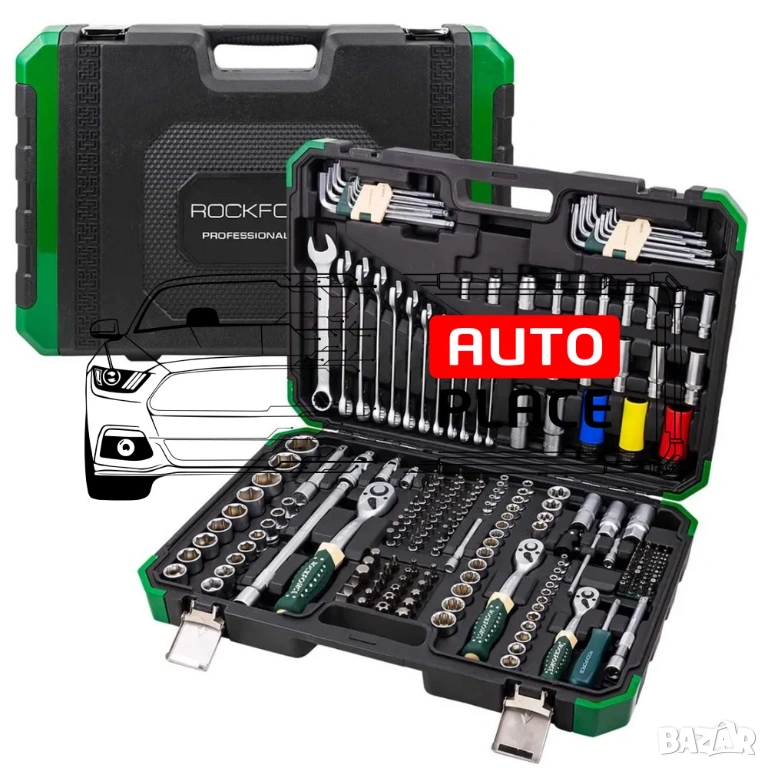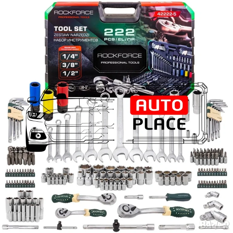 Комплектът Rockforce от 222 части е универсален набор от инструменти за автомеханици, ремонтни техници, монтажници и „Направи си сам“ майстори. Той включва три квадратни задвижвания (1/4″, 3/8″, 1/2″) и покрива пълен набор от приложения, от прецизен монтаж до тежкотоварни инсталации. Всички компоненти са изработени от издръжливи материали (CRV, CRMO) и се съхраняват удобно в куфар за носене.
