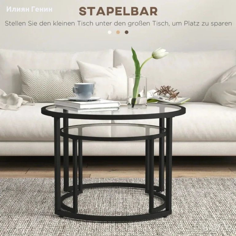 Отделно или заедно: Комплектът стъклени масички се състои от малка и голяма странична масичка и може да се използва самостоятелно като масичка за кафе или заедно като комплект странични масички, като се плъзне малката масичка под голямата, за да се спести място.