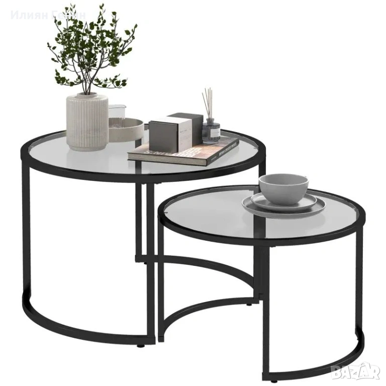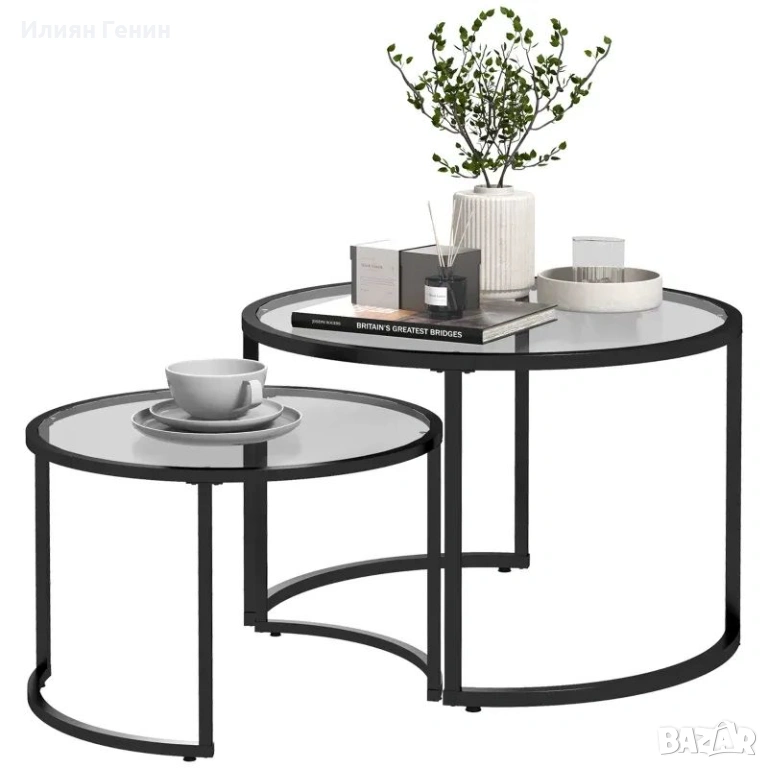 Комплект от 2 странични масички/масички за кафе HOMCOM, индустриален дизайн, стъклени маси, подреждащи се, черни + прозрачни - 90.00 €.