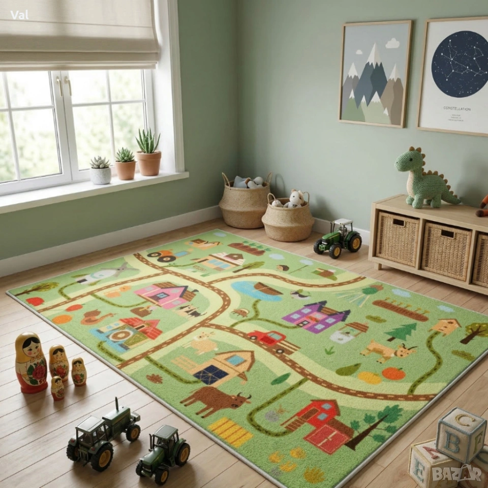Детски килим за игра 120х160см - Светлозелен килим с ферма и животни, противоплъзгащ и миещ се