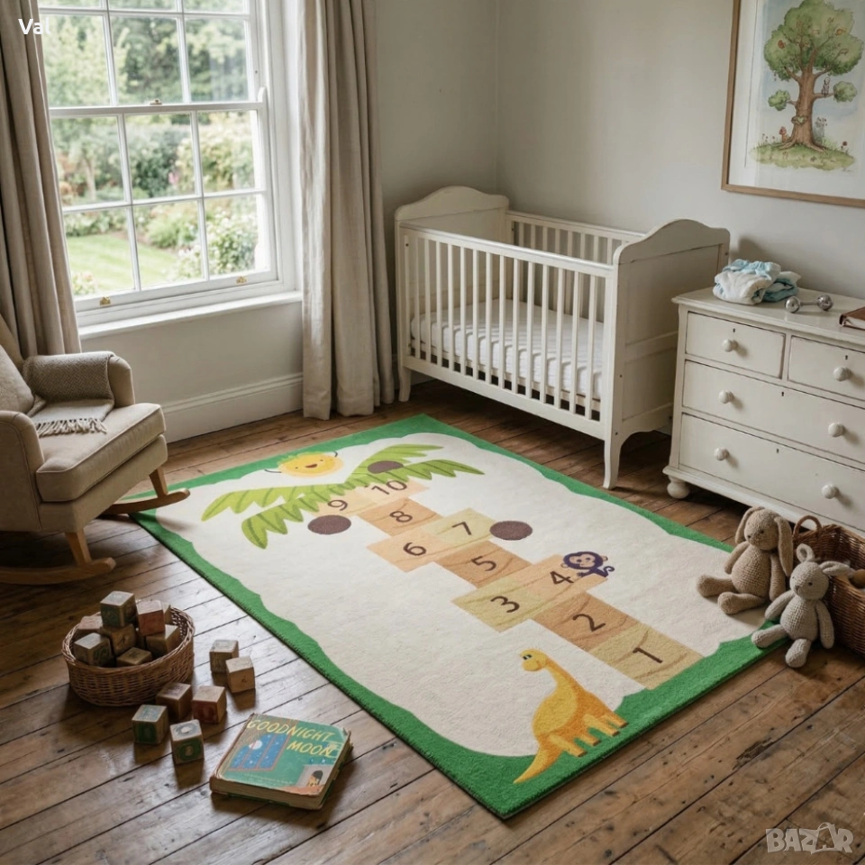 Детски килим за игра 120х160см - Бял килим с динозавър и дама-палма, противоплъзгащ и миещ се
