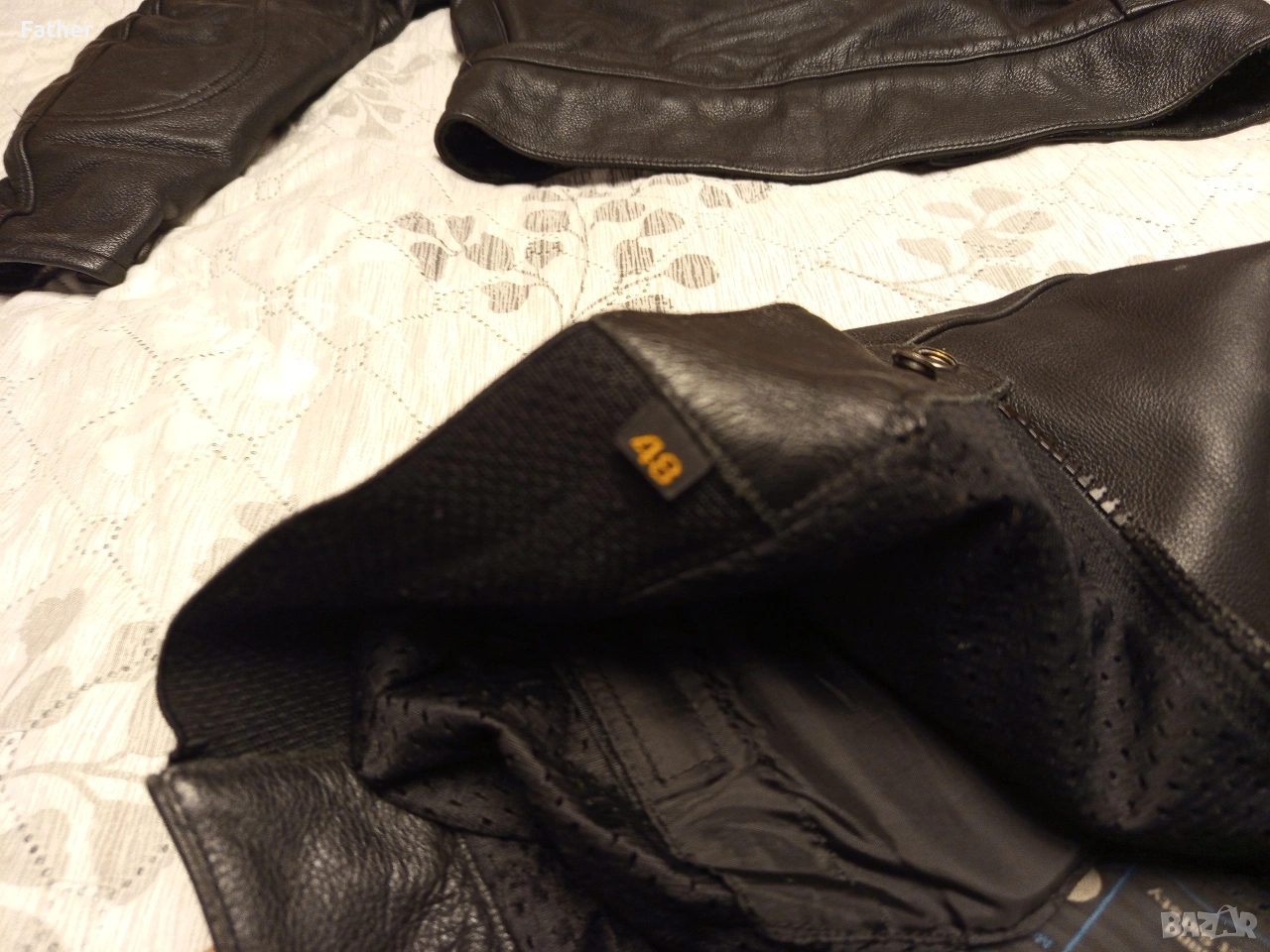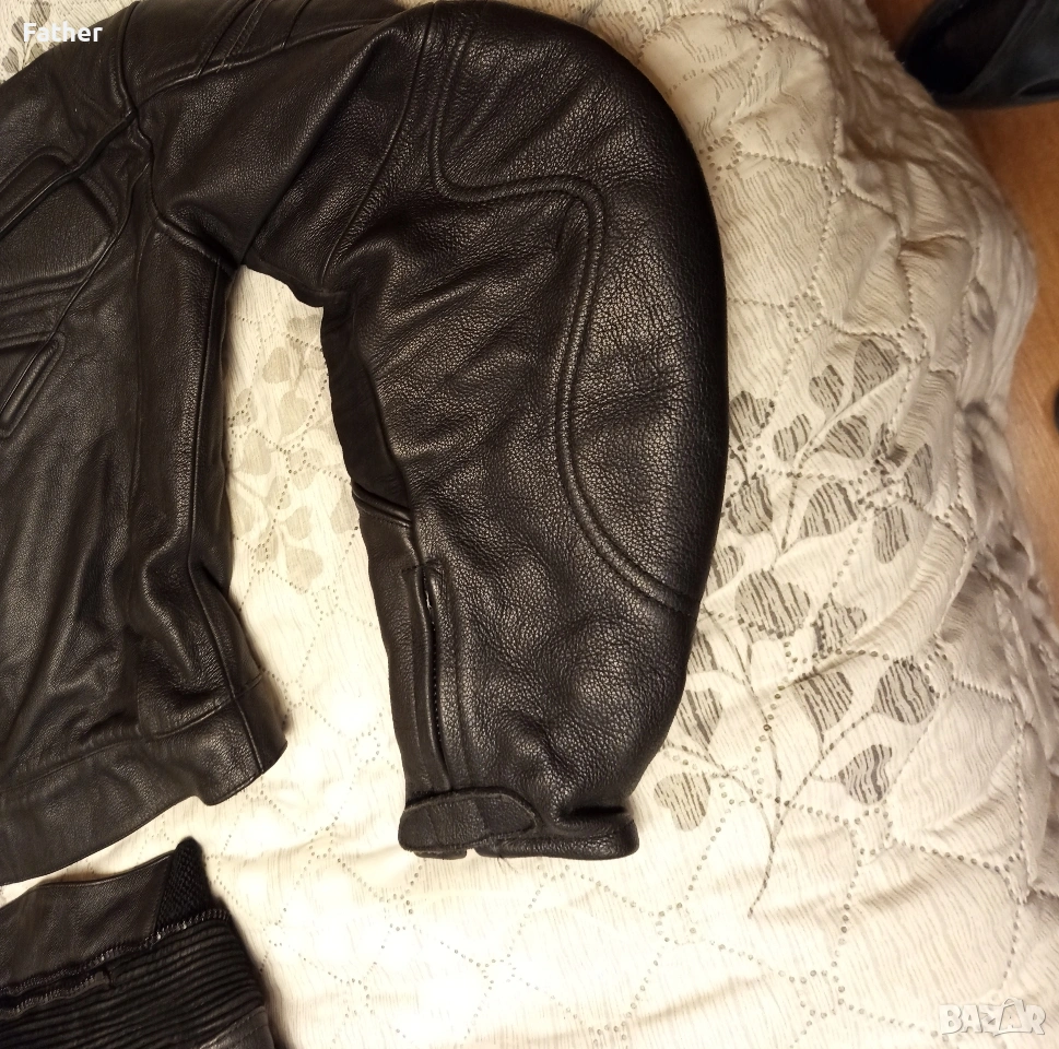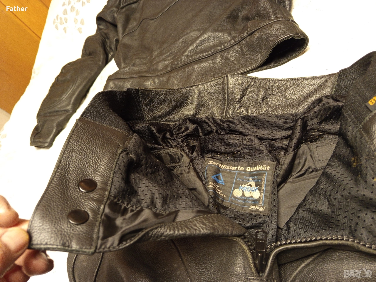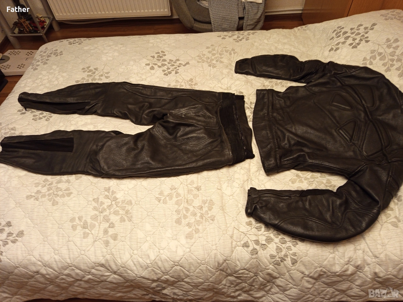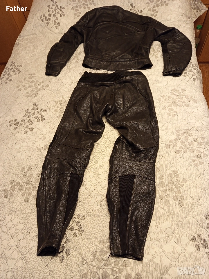 Екипа е в отлично състояние. Размер яке 52/ панталон 48. Изработен от висококачествена естествена кожа. С налични всички протектори. Няма скъсано и протрито а циповете работят нормално. Двойно закопчаване между якето и панталона.