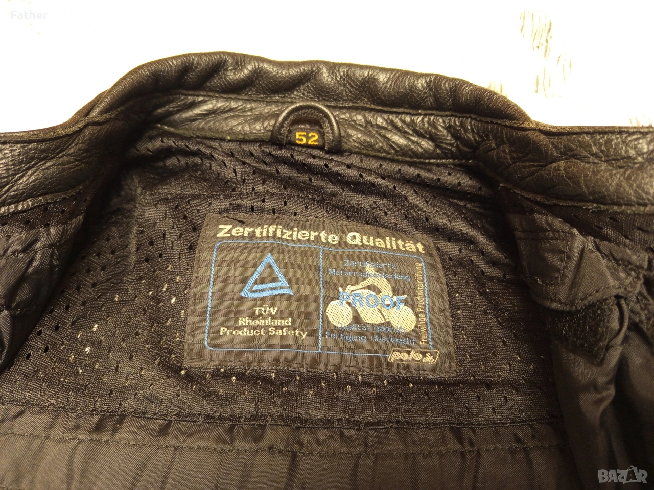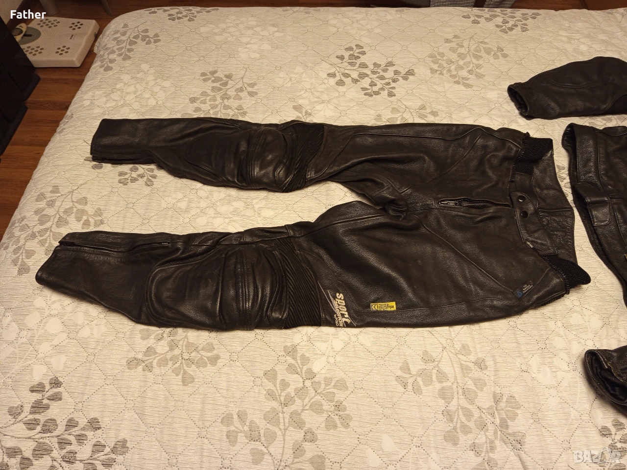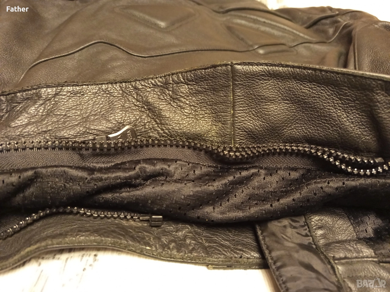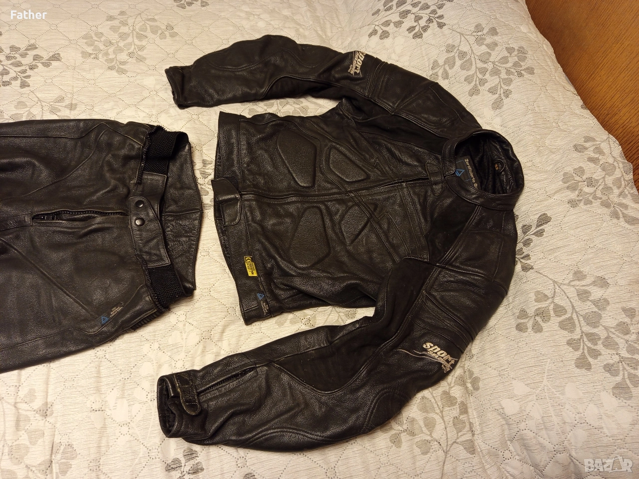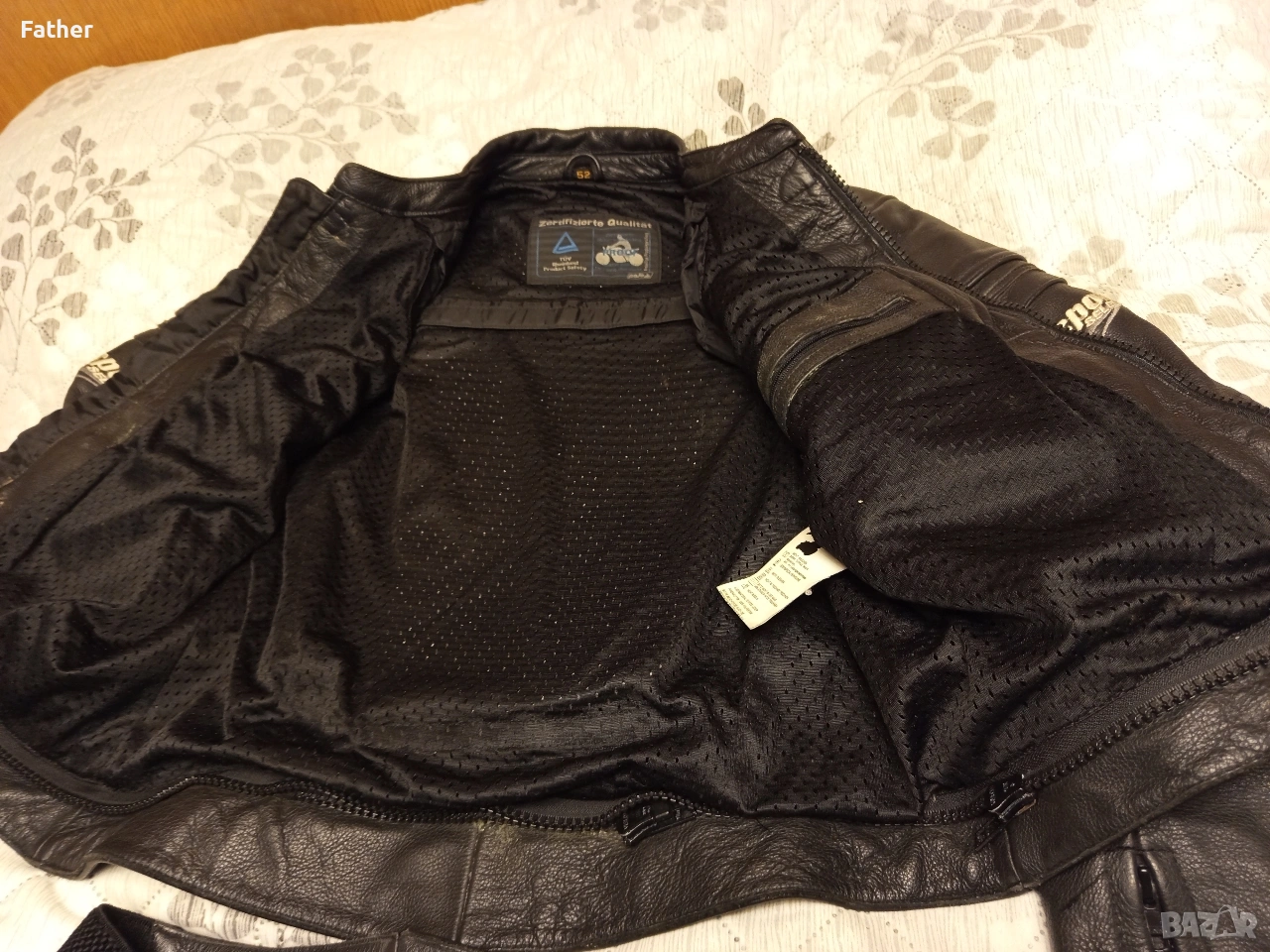 Екипа е в отлично състояние. Размер яке 52/ панталон 48. Изработен от висококачествена естествена кожа. С налични всички протектори. Няма скъсано и протрито а циповете работят нормално. Двойно закопчаване между якето и панталона.