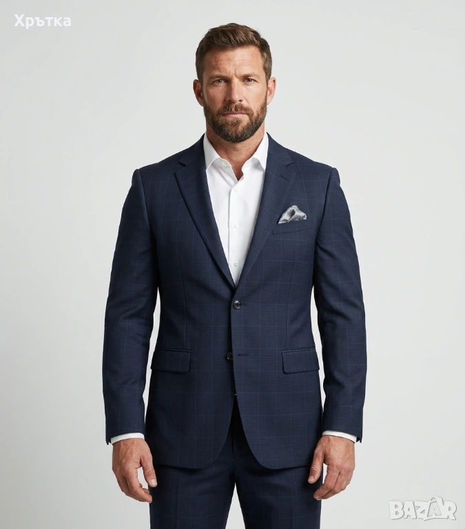 Класически ревери, два външни джоба с капак, горен джоб за кърпичка и функционални вътрешни джобове.