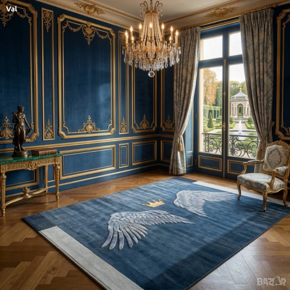 Модерен килим за хол 120х160см - Тъмносин с крила и корона и 3D ефект, Противоплъзгащ