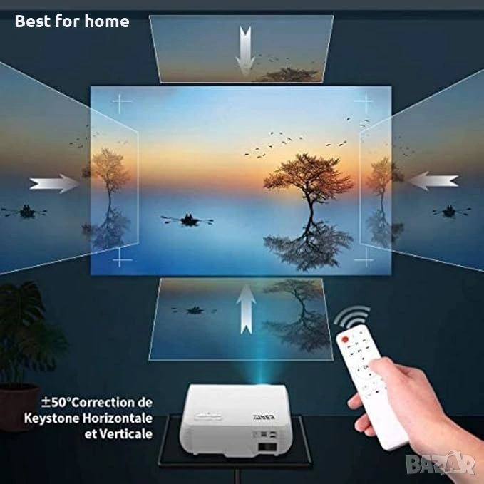【Разширени 4D функции за корекция на трапецовидно изкривяване и мащабиране】 WiFi Bluetooth проекторът използва технология за 4D електронна корекция на трапецовидно изкривяване (хоризонтална и вертикална), която постига четириъгълна корекция на трапецовидно изкривяване нагоре, надолу, наляво и надясно. Функцията за X/Y мащабиране може да намали размера на проекцията, което ви позволява да регулирате изображението, без да променяте размера на проектора, което улеснява настройката.