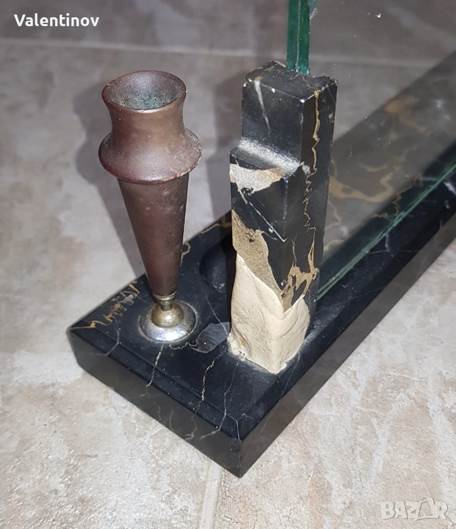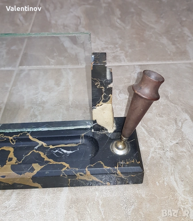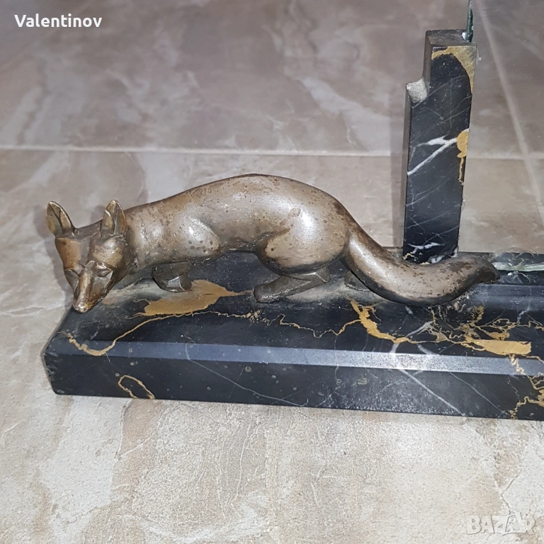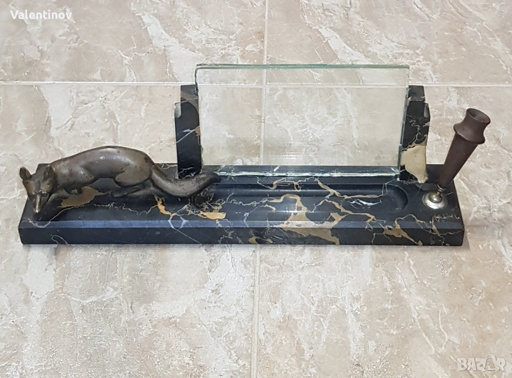 Старинна, мраморна поставка за снимка и молив, две стъкла, вежду които се слага снимката и декор- лисица. Височина- 12,5см, размери на основата- 7/ 32,5см. Поставката за молив е подвижна. Едната колона държаща стъклата е била повредена и доправяна.