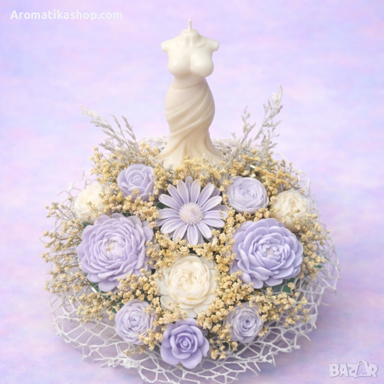 Силует на Любовта е изискан, ръчно изработен букет от 100% чист соев восък, вдъхновен от елегантността на булчинската красота. Централният акцент е изящна свещ във формата на женски силует – символ на финес, стил и чиста любов. Около нея са подредени пастелни рози, маргаритки и флорални детайли, обвити в нежна гипсофила, които превръщат букета в истинско произведение на изкуството.