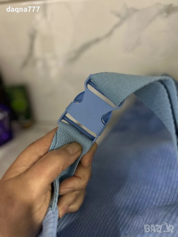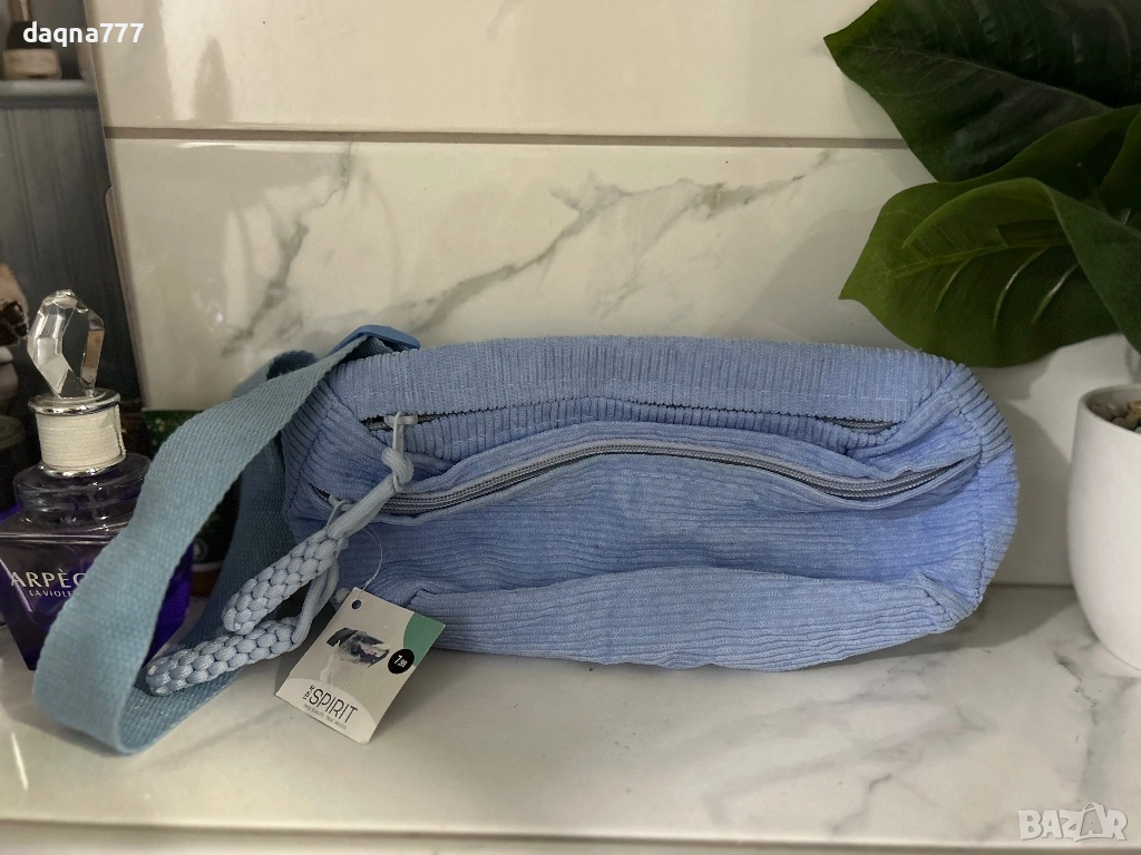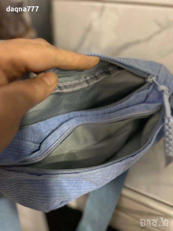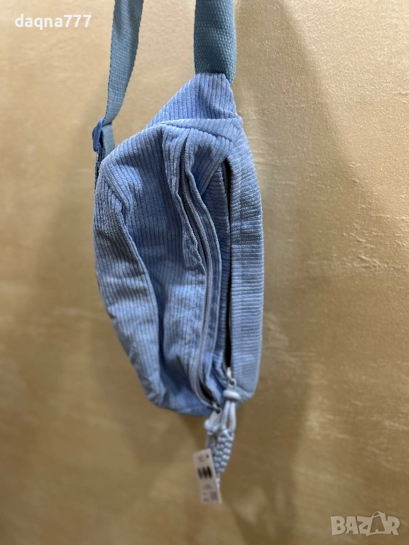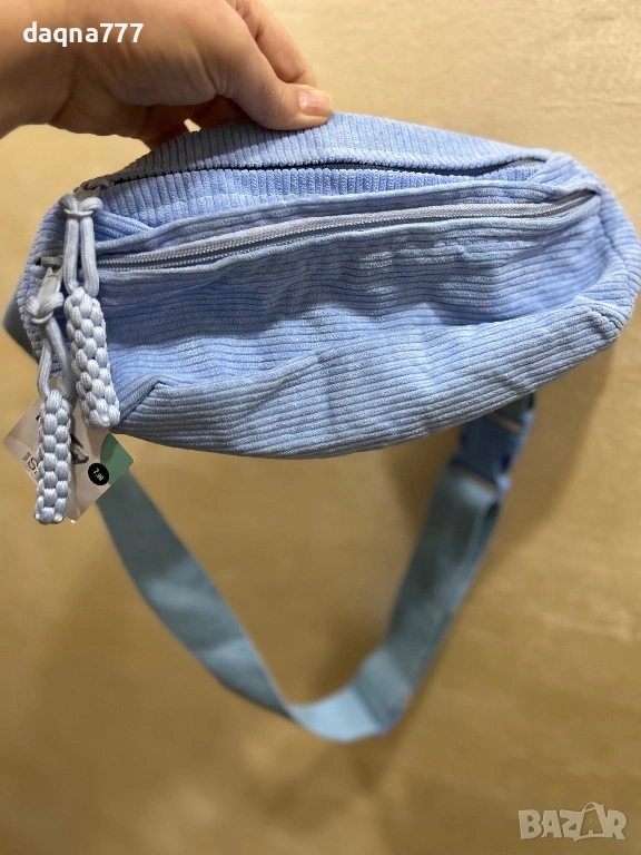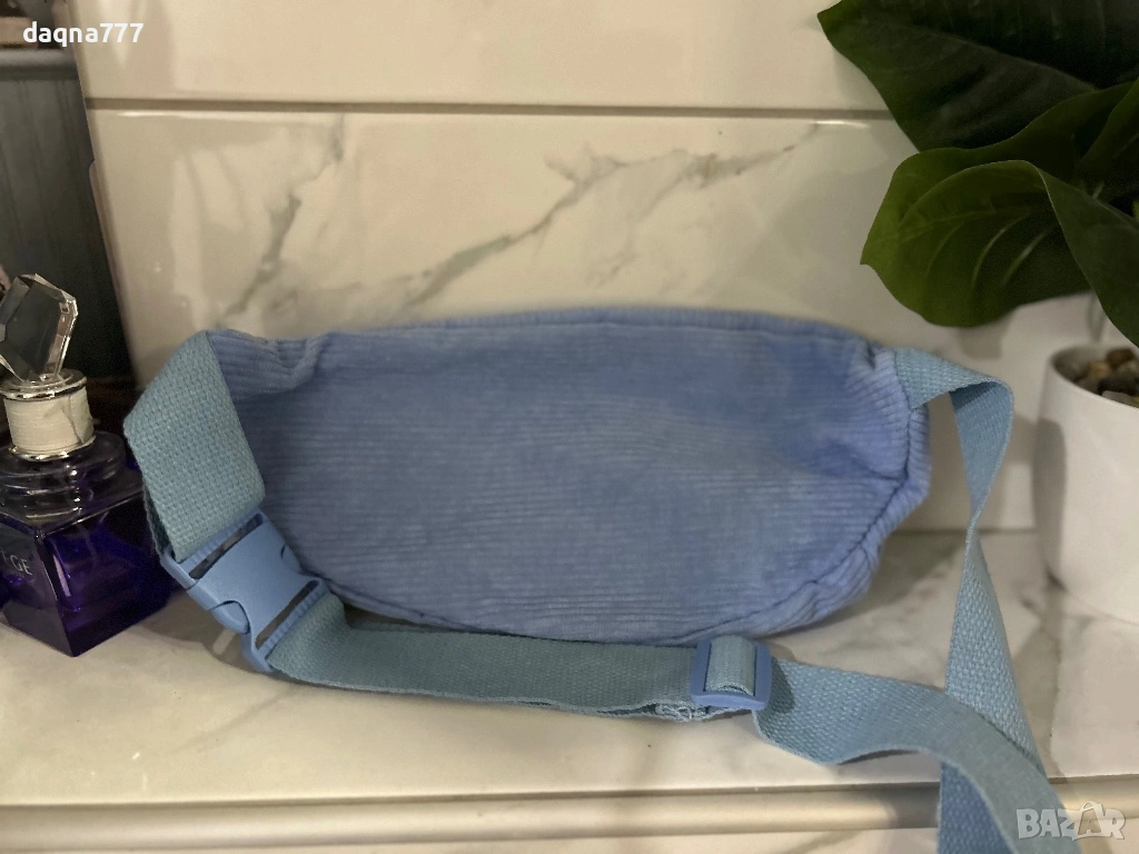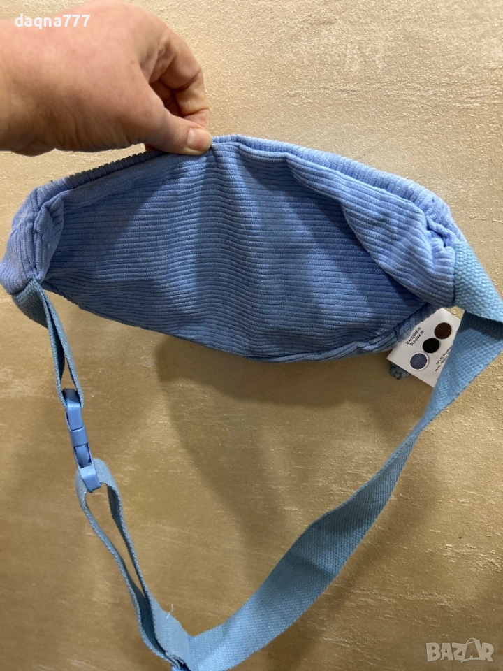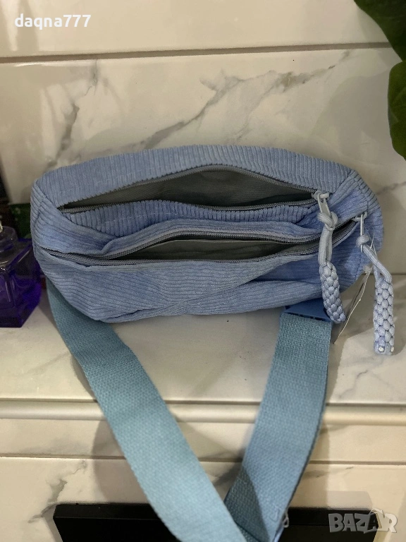 Тази синя велурена чанта (тип „банана“) е модерен и практичен аксесоар, изработен от меко и издръжливо рипсено кадифе (corduroy). Дизайнът е в ретро стил, подходящ за ежедневно носене като чанта за кръста, или през рамо (crossbody).