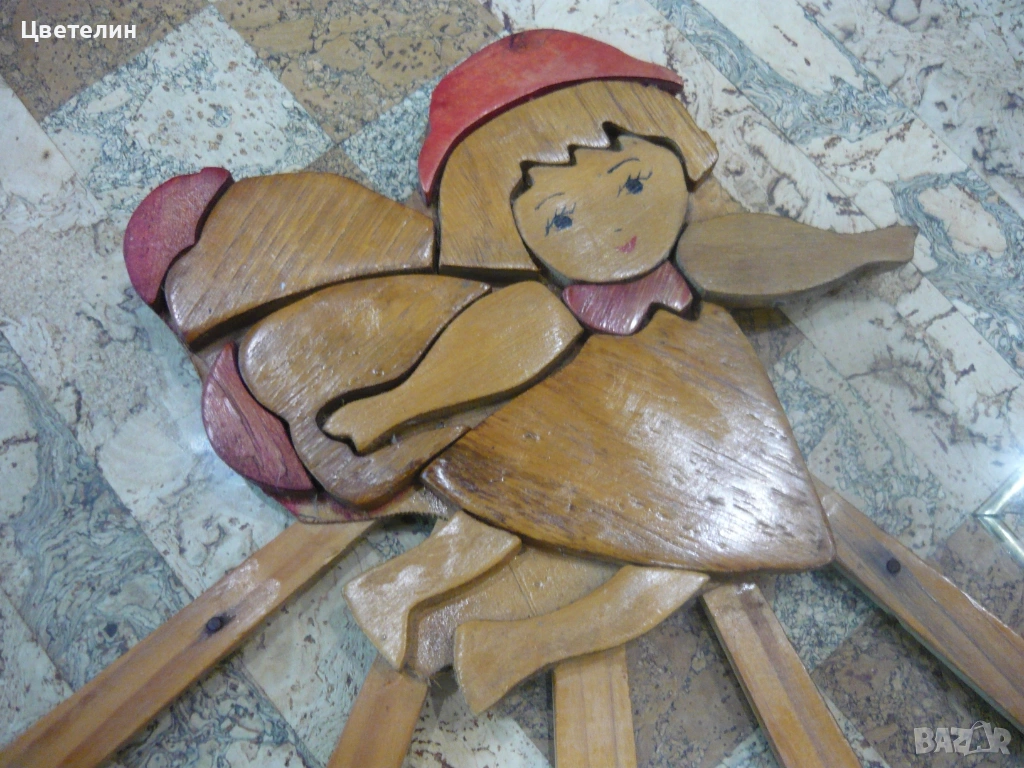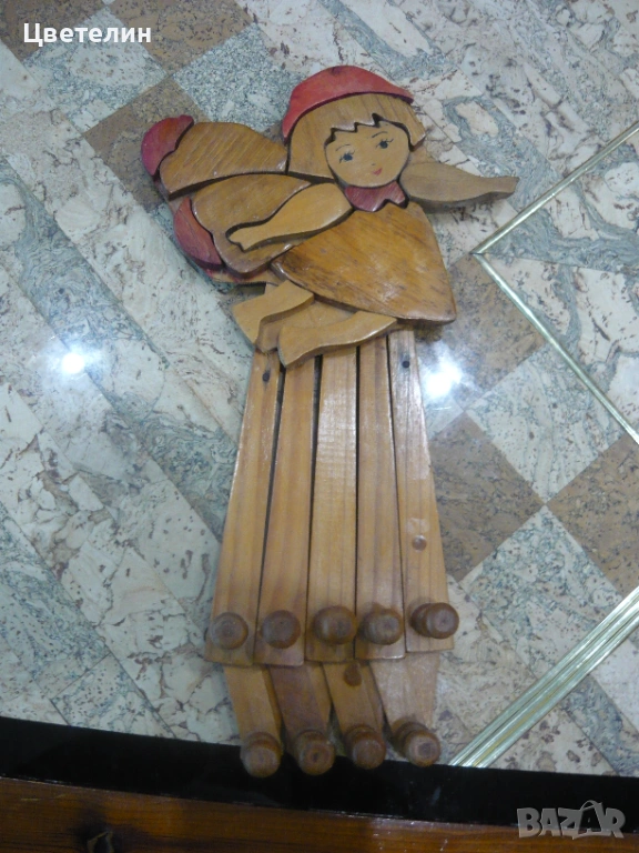 Стара дървена закачалка с интересна дизайнерска форма. Изработена от дърво и боядисана с традиционни цветове. Въпреки възрастта си, закачалката е в добро състояние и може да бъде използвана за декорация или практически цели. Размерите в разгънат вид са: 40х31 см.