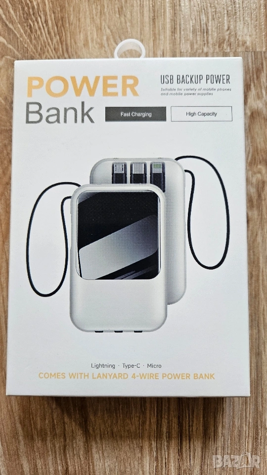 Тип: Преносимо зарядно устройство с 4 вградени кабела (Lightning, Type-C, Micro USB).