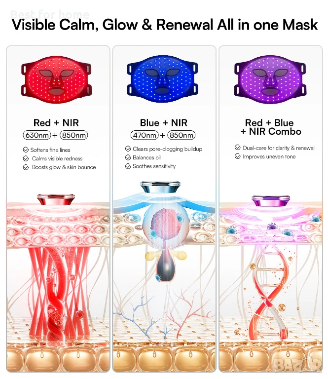 Двойна дължина на вълната за ревитализация: Маската за лице INIA Red Light Mask комбинира червена светлина с дължина на вълната 630 nm за повърхностно обновяване и близка инфрачервена светлина с дължина на вълната 850 nm за по-дълбока поддръжка на кожата. Този дизайн с двойна дължина на вълната позволява дълбоко проникване и доставяне на енергия, спомагайки за стимулиране на колагена и еластичността на кожата. Натиснете бутона „NIR“, за да активирате и двата режима и да подобрите рутинната си грижа за кожата.