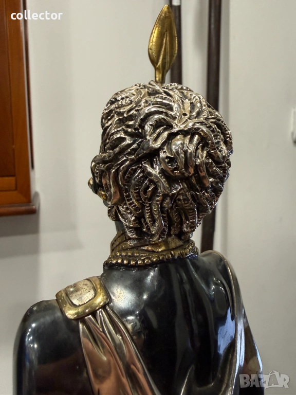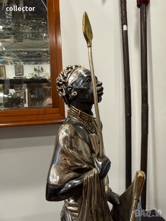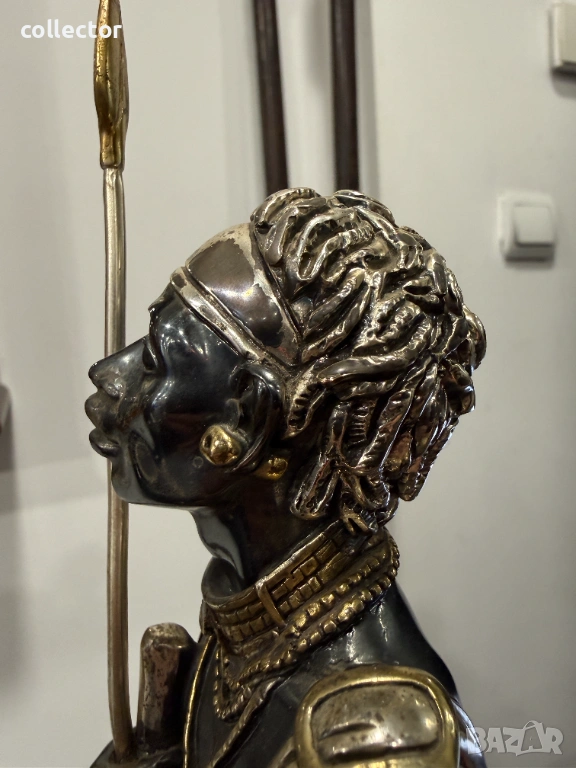 Основното тяло е от смола (полирезин), като върху нея е нанесен слой от сребро 925 чрез галванопластика (сребърно фолио). Златистите акценти по копието, щита и накитите са с 24-каратово златно покритие.