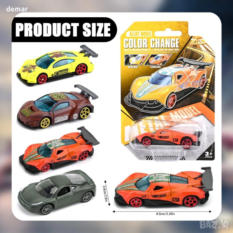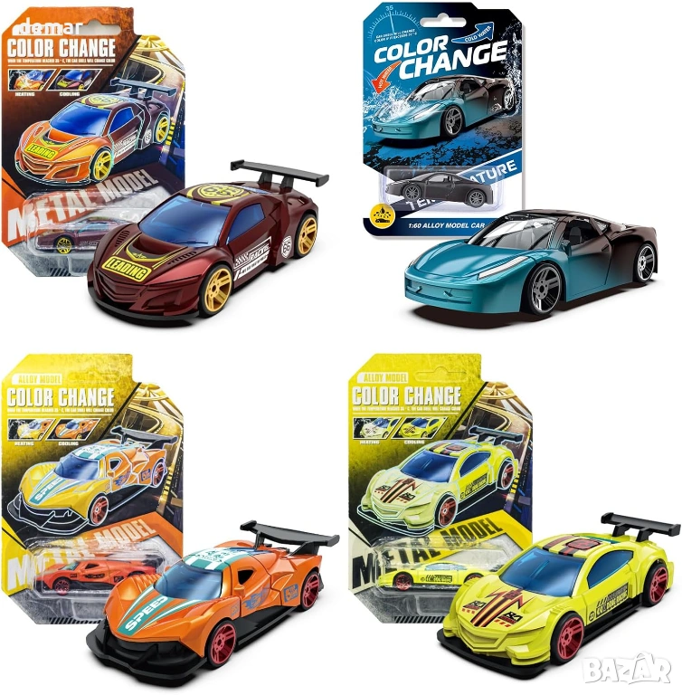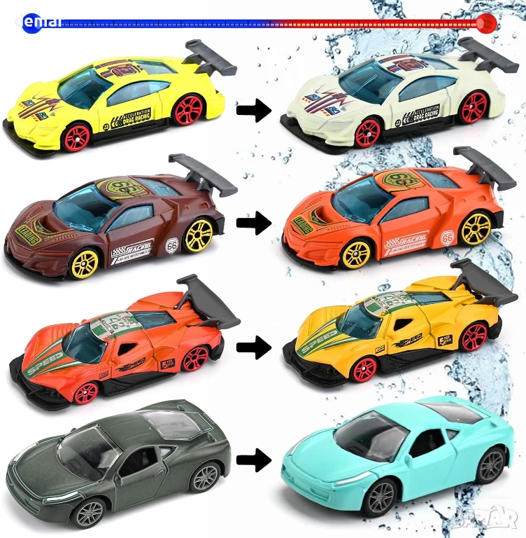 Комплект от 4 мини колички играчки от алуминий с функция за промяна на цвета, активирана от вода, трансформиращи се при излагане на топла или студена вода за интерактивно къпане или игра; изработени с издръжливи метални корпуси за дълготрайна употреба, компактен дизайн в състезателен стил, подходящ за малки ръчички, насърчаващ сензорната ангажираност и въображаемата игра, което ги прави привлекателен вариант за подарък за деца.