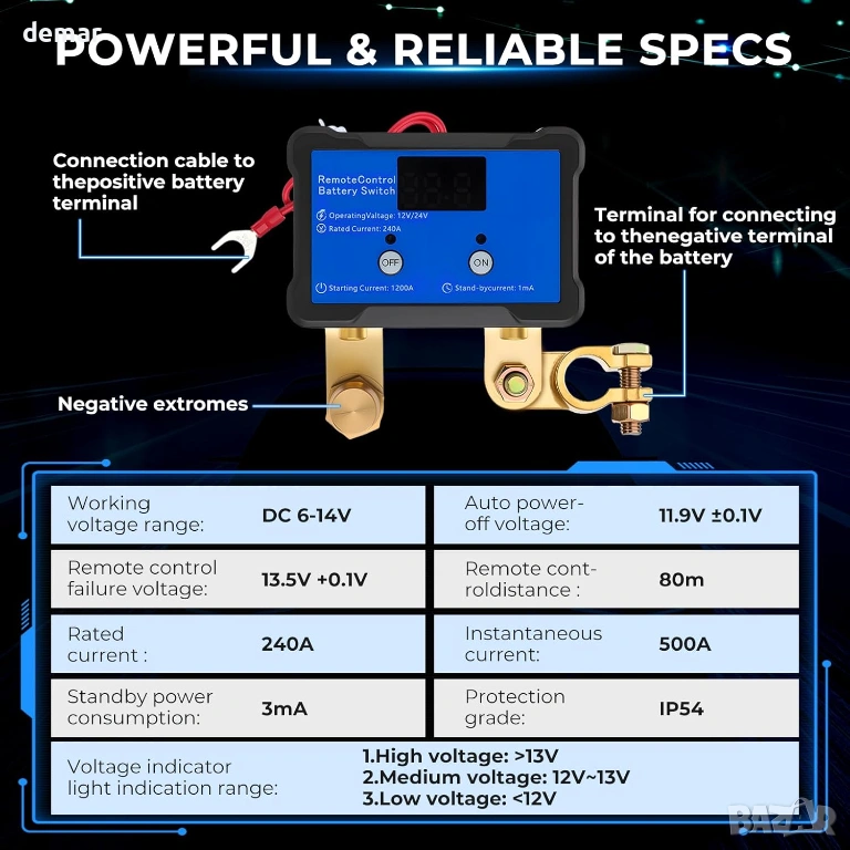 Интелигентният прекъсвач за батерията с приложение и дистанционно управление ви позволява да наблюдавате и изключвате захранването в обхват от 20 метра или дистанционно от големи разстояния, повишавайки безопасността и удобството. Проектиран да предотвратява изтощаването на батерията по време на дългосрочно паркиране, той помага за удължаване на живота на батерията, като същевременно предпазва от проблеми като забравени светлини или стареещо окабеляване. Съвместим с широка гама от 12V/24V превозни средства, включително автомобили, кемпери, лодки и мотоциклети, той поддържа надеждна работа при различни приложения. Изработен от издръжливи материали за дълготрайност, той се отличава с ниска консумация на енергия в режим на готовност, за да се избегне ненужно изтощаване, и включва автоматична защита от изключване, за да предпази батерията от ненормални нива на напрежение и потенциални рискове, като също така добавя допълнителен слой защита против кражба.