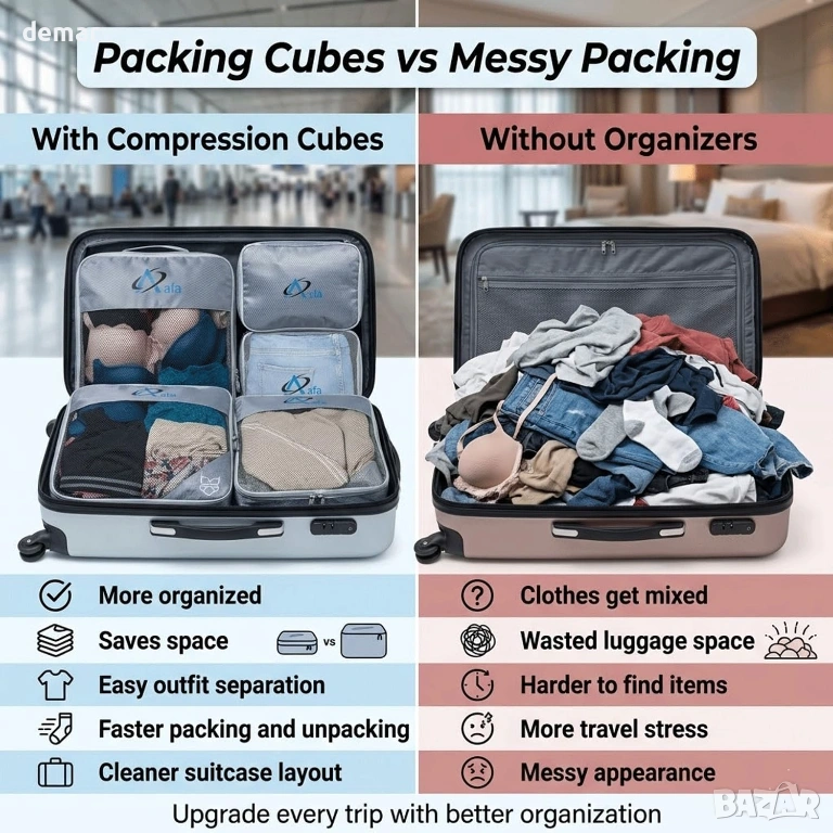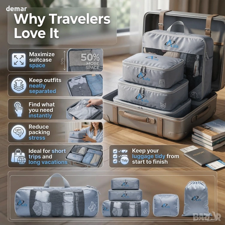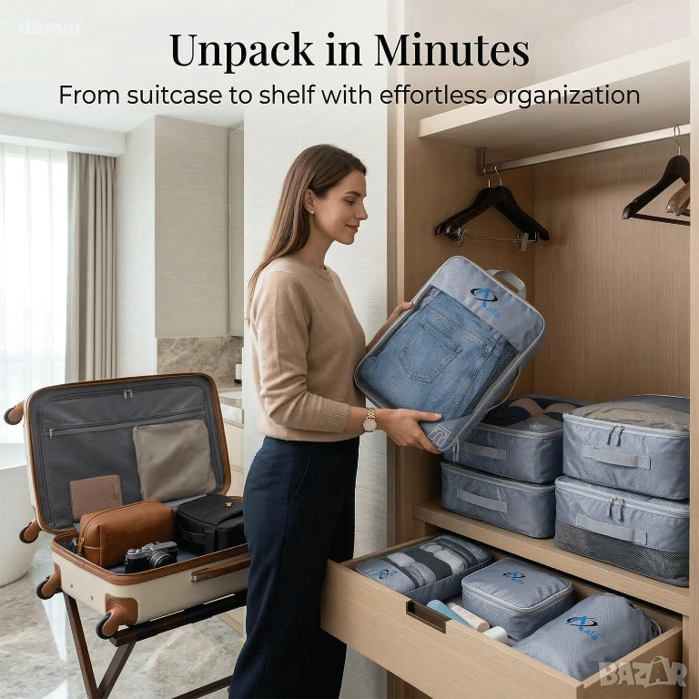Комплект от 7 компресионни кубчета за съхранение, предназначени за ефикасно организиране на дрехи, обувки и аксесоари, като същевременно намаляват обема на багажа с до 70%. Разполага с двойна ципова система за гладка и сигурна компресия, издръжлива водоустойчива и устойчива на разкъсване материя за надеждна употреба при дълги пътувания и дишащи мрежести панели за лесна видимост и свежест. Идеален за куфари или раници, помага за максимално използване на пространството и поддържане на вещите спретнато подредени по време на пътуване.