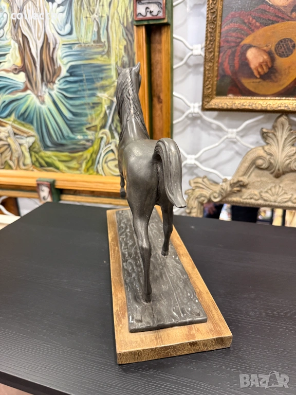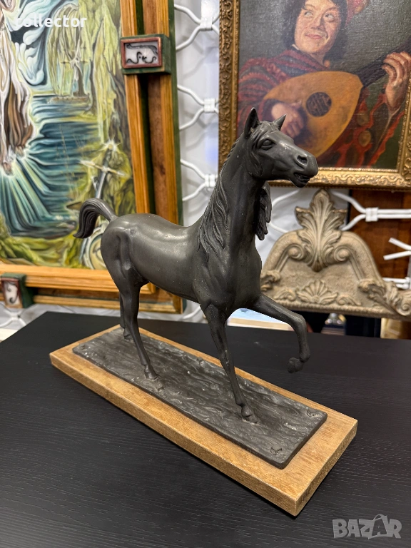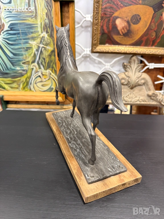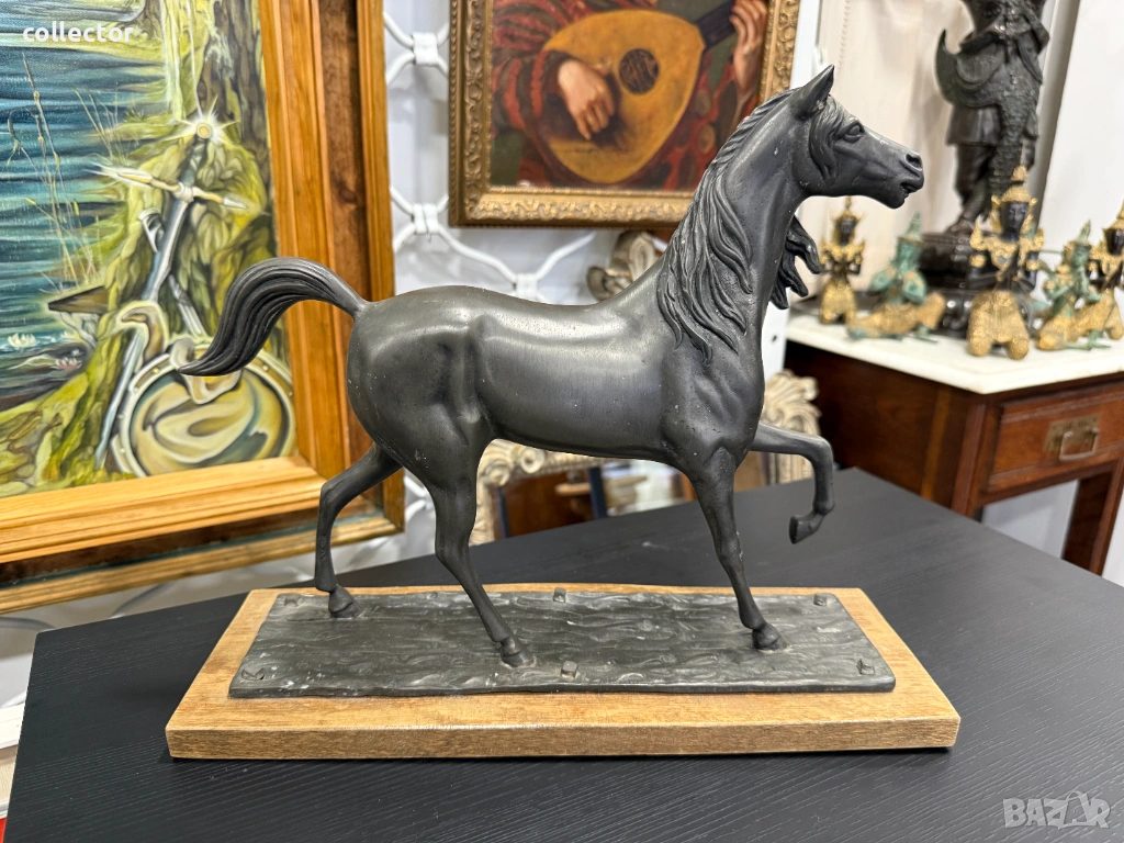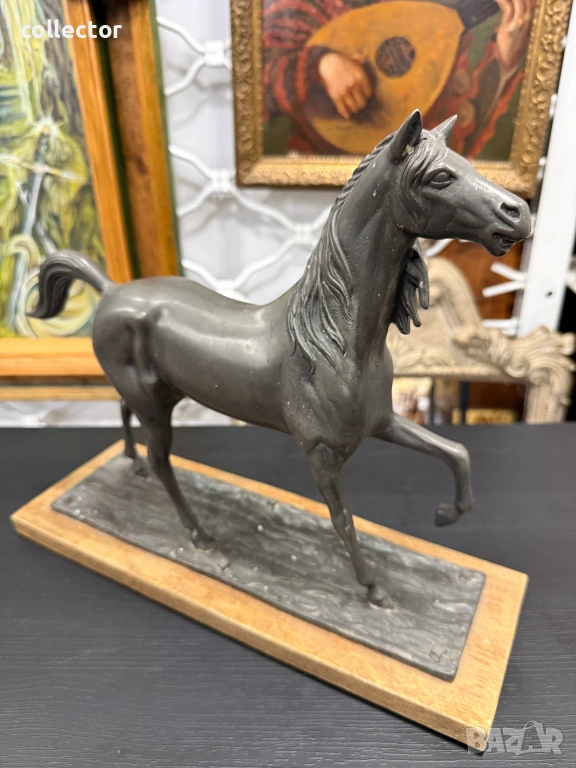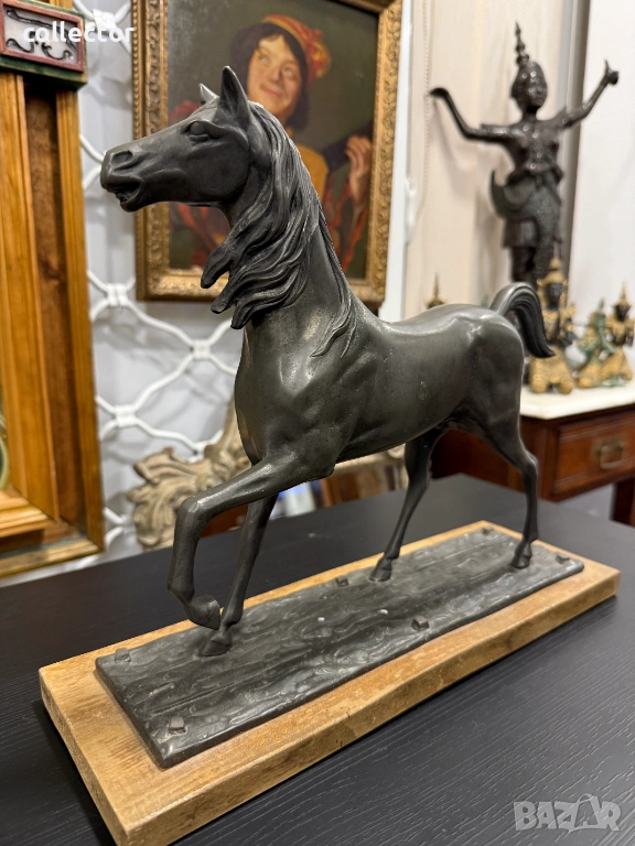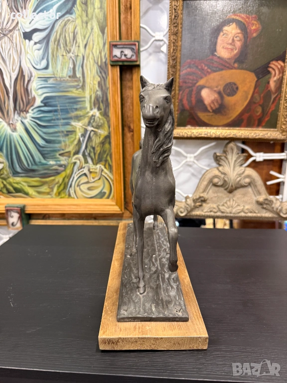 Фигурата е в динамична поза с повдигнат преден крак и развята грива, което символизира благородство и енергия. Изработен от шпиат (сплав от цинк, олово и калай) с тъмна патина, поставена върху правоъгълен дървен постамент.