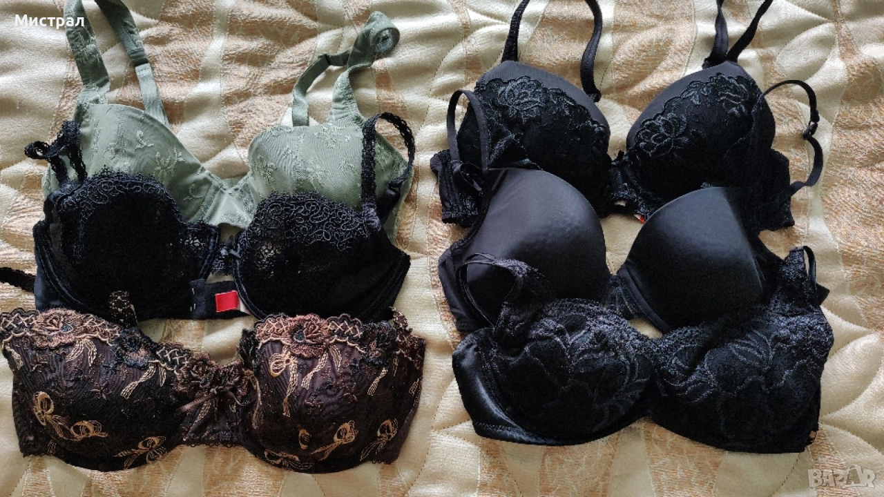 Бельото е в перфектно състояние. Снимка 1 отдолу нагоре размер 90 B, цена 16 евро размер 90C, цена 16 евро ( налични 2 броя) Снимка 2, размер 85 В, , цена 13 евро Снимка 3, размер 85 В, цена 13 евро Снимка 4, размер 85 С, цена 16 евро Снимка 5, размер 80В, 15 евро Снимка 6, размер 80 С, 15 евро Снимка 7, размер 80 D 15 евро Снимка 8 размер 75 0/А, push up ефект, 13 евро Снимка 9, размер 75 А, 16 евро Снимка 10, размер 75 D, модел втора кожа, 15 евро Снимка 11отдолу нагоре: 1. Размер 70 С, 15 евро 2. Размер 70 Е, 16 евро Снимка 12 сутиени размер 75 С/ В, цена 10 евро за брой