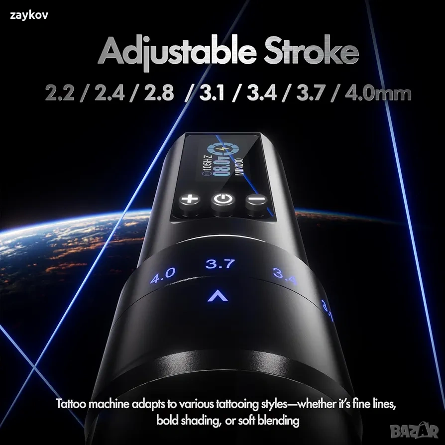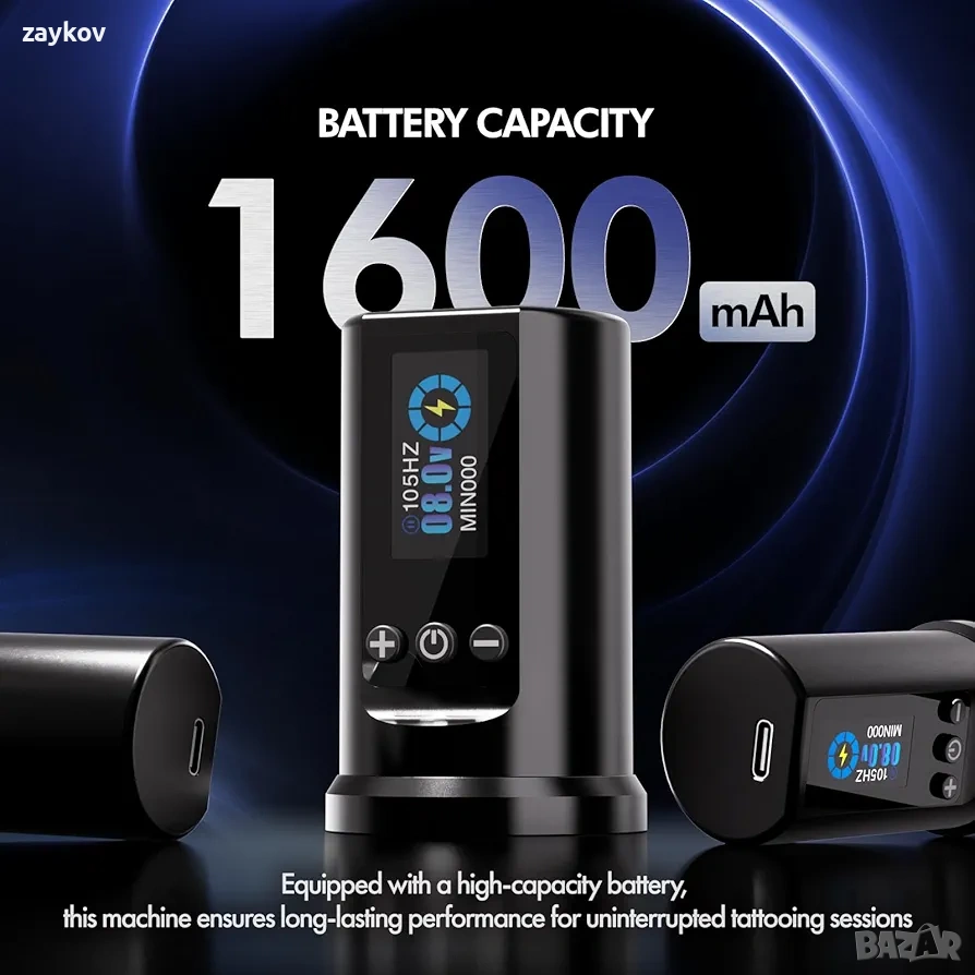 Дълъг живот на батерията с OLED дисплей: машината за татуировки е оборудвана с батерия от 1600 mAh, която позволява 5-7 часа непрекъсната работа с пълно зареждане. Времето за зареждане е само приблизително 2 часа. Вграденият OLED дисплей ясно показва напрежението и нивата на батерията - така че винаги да имате контрол, докато работите. В сравнение с подобни машини за татуировки на пазара, този модел предлага комбинация от високо качество и достъпна цена.